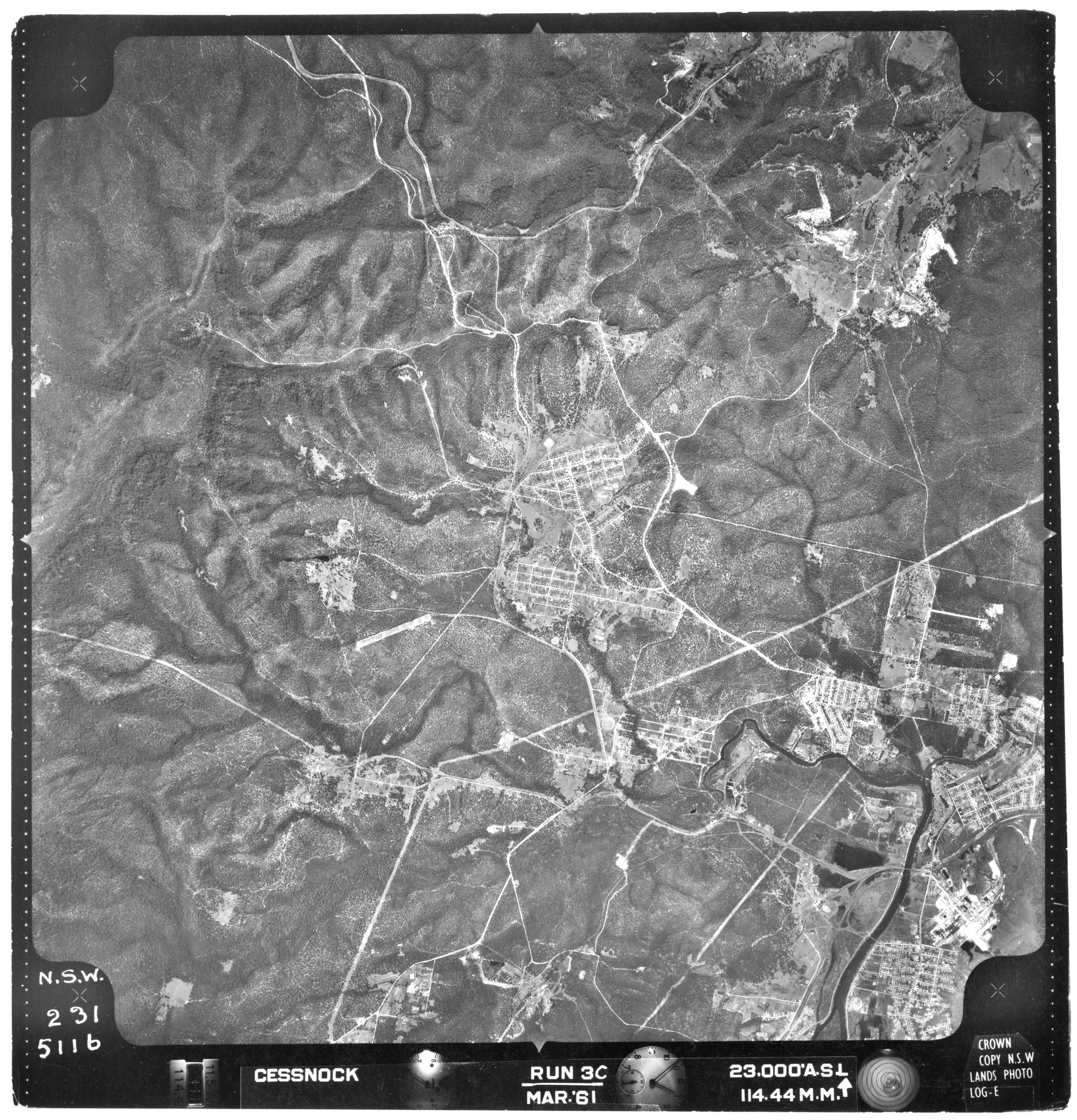 New South Wales. Department of Lands, Cessnock, NSW - Aerial photograph, March 1961 (5116) (1961-03), [CESSNOCK-03-1961-R003C-231-5116]. Living Histories, accessed 15/03/2026, https://livinghistories.newcastle.edu.au/nodes/view/80713