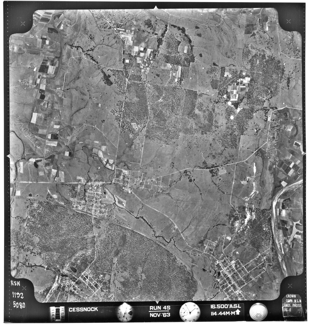 New South Wales. Department of Lands, Cessnock, NSW - Aerial photograph, November 1963 (5080) (1963-11), [CESSNOCK-11-1963-R004S-1192-5080]. Living Histories, accessed 12/02/2026, https://livinghistories.newcastle.edu.au/nodes/view/80809