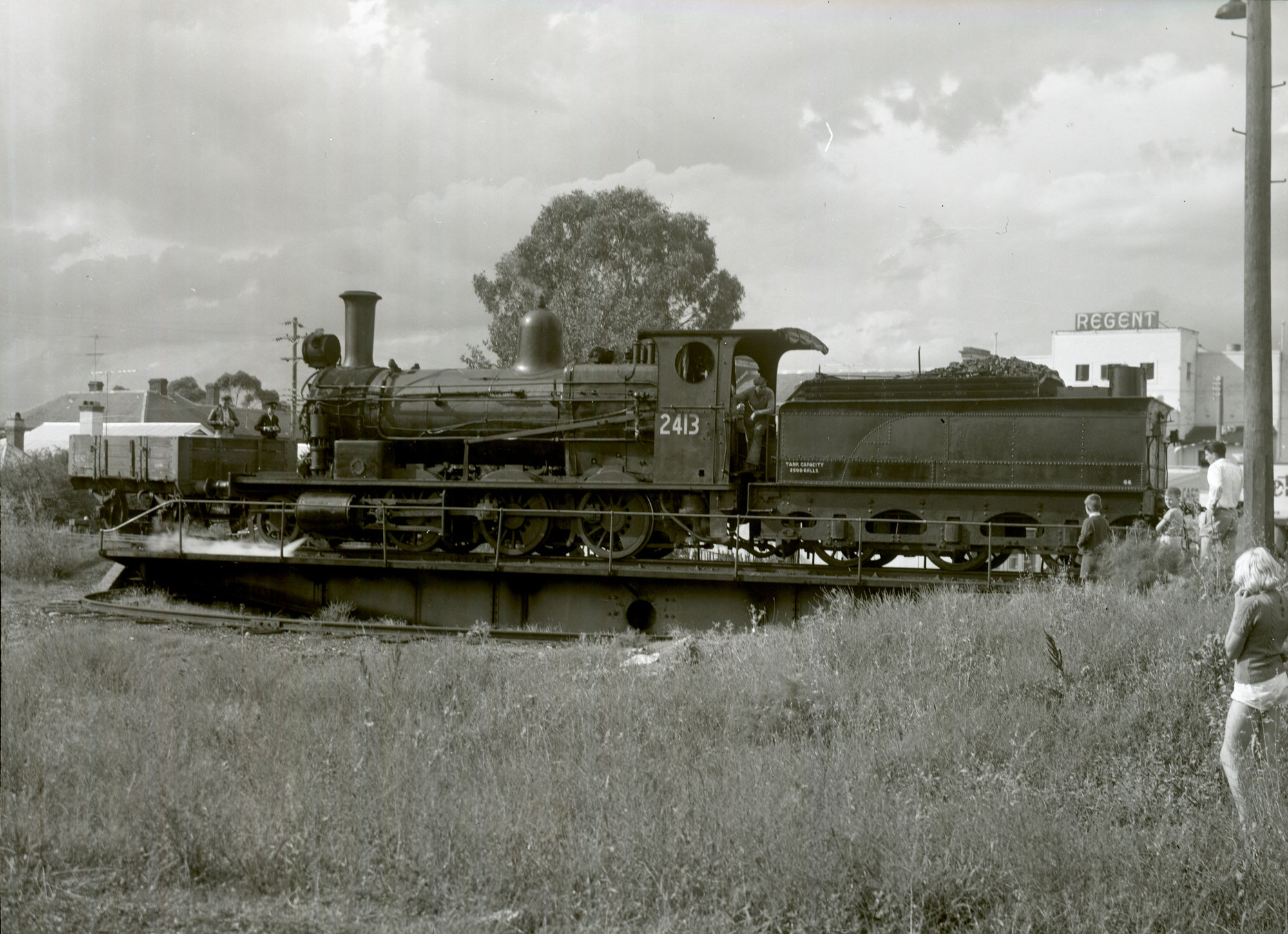 NSWGR Z24 Class No. 2413 2-6-0 Mogul Type on turntable at Richmond, [1960] ([1960]), [ARHSBox010_0273]. Living Histories, accessed 19/03/2026, https://livinghistories.newcastle.edu.au/nodes/view/8089