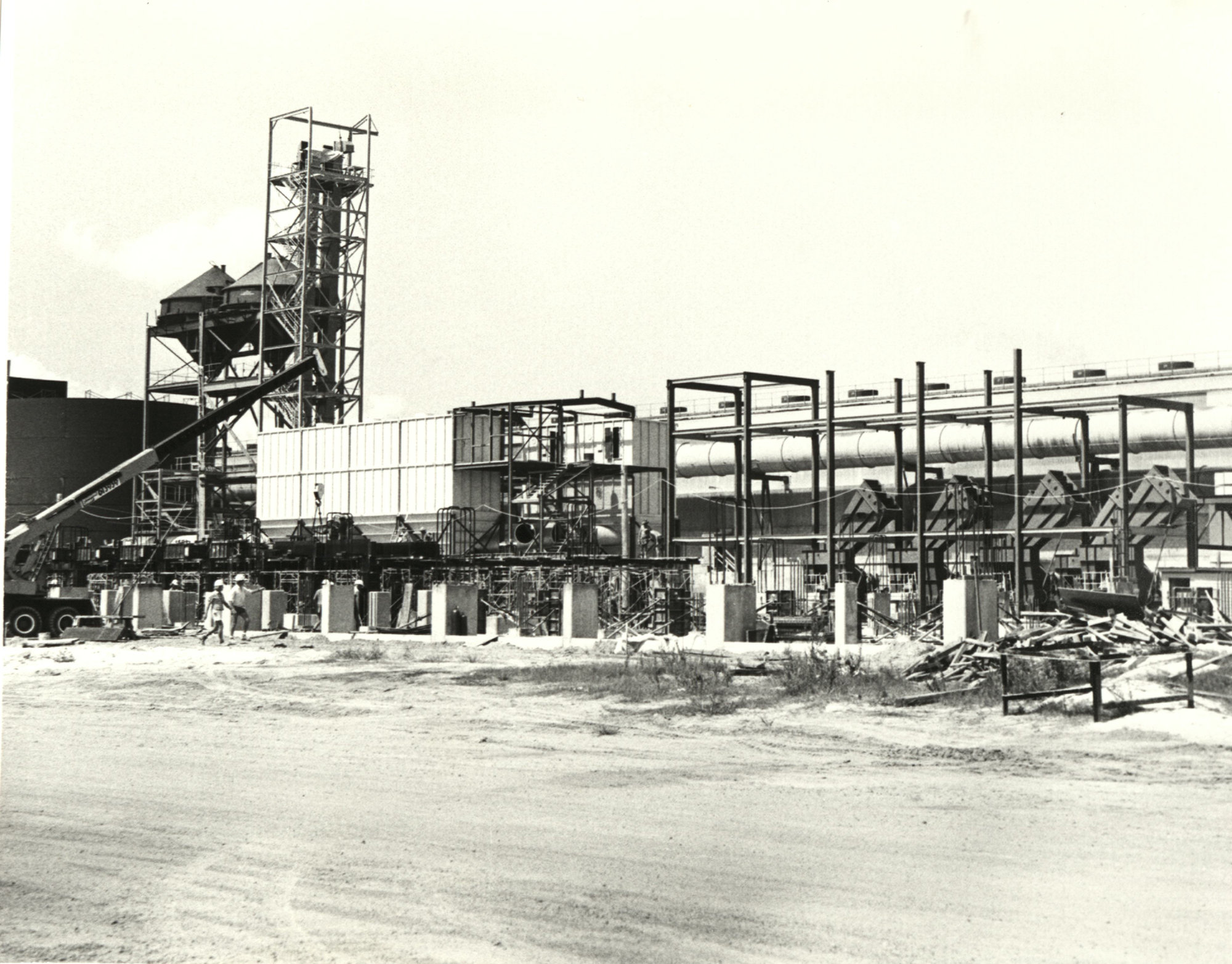 Ground level view of scrubber construction from the south-west, Alcan (Australia), Kurri Kurri Works, 2 February 1979. (2nd February 1979), [KII-082]. Living Histories, accessed 16/01/2026, https://livinghistories.newcastle.edu.au/nodes/view/81133
