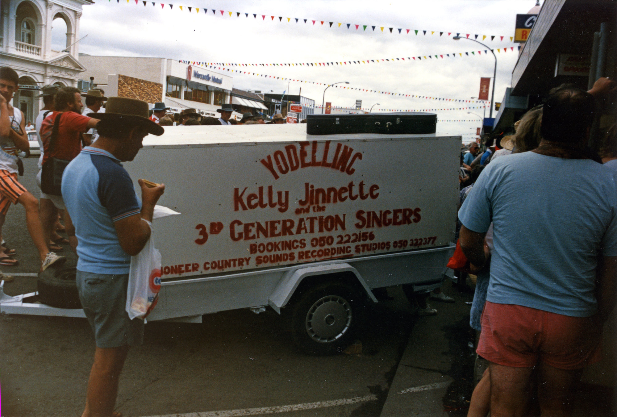 Sternbeck, Percival William, 1921-2004, Kelly & Jinnette & the 3rd Generation Singers - van. Tamworth, NSW. Taken during the Tamworth Country Music Festival, January 1989 (Between 1st January 1989 and 31st January 1989), [Sternbeck_Bk22__0189_019]. Living Histories, accessed 14/03/2026, https://livinghistories.newcastle.edu.au/nodes/view/81316