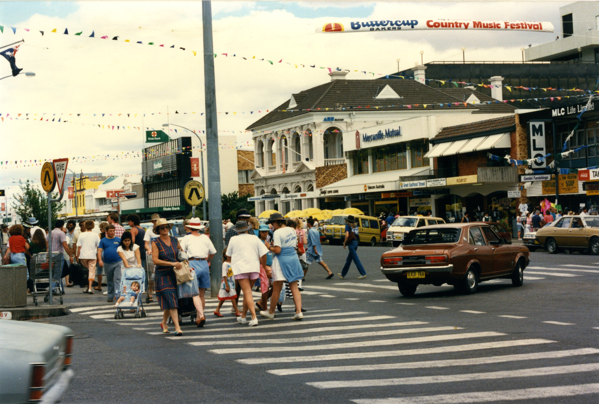 Sternbeck, Percival William, 1921-2004, Pedestrian crossing, Tamworth, NSW. Taken during the Tamworth Country Music Festival, January 1989 (Between 1st January 1989 and 31st January 1989), [Sternbeck_Bk22_Tamworth_0189b_013]. Living Histories, accessed 19/03/2026, https://livinghistories.newcastle.edu.au/nodes/view/81352