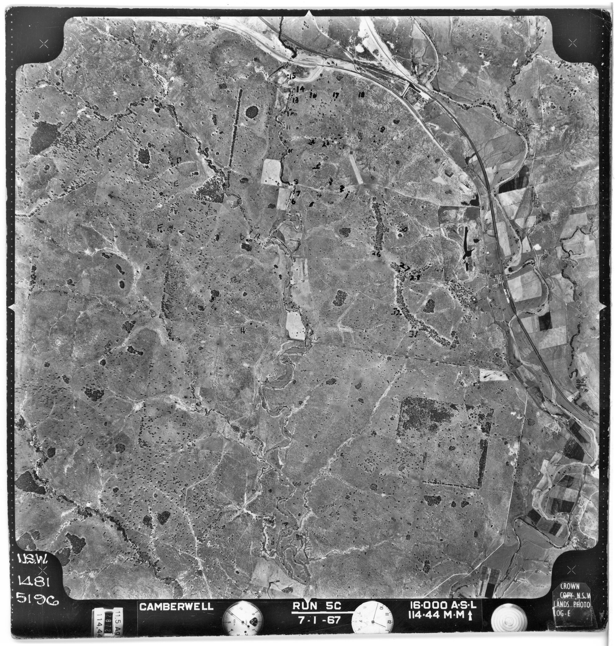 New South Wales. Department of Lands, Camberwell, NSW - Aerial photograph, January 1967 (5196) (7th January 1967), [CAMBERWELL-01-1967-R005C-1481-5196]. Living Histories, accessed 11/03/2026, https://livinghistories.newcastle.edu.au/nodes/view/81401
