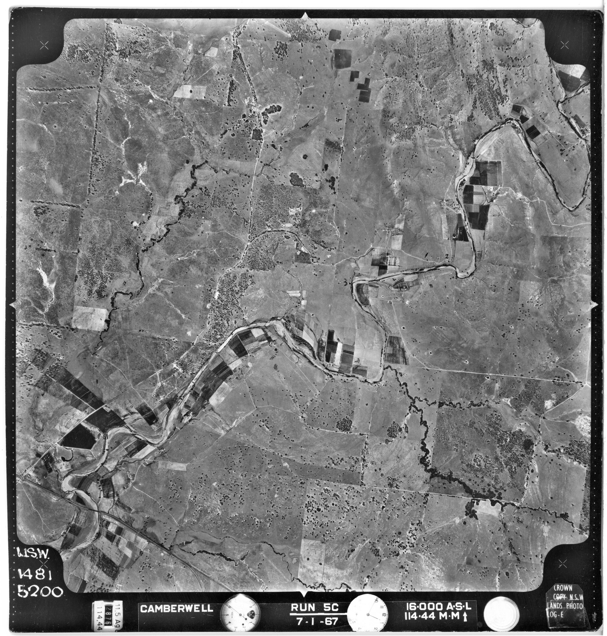 New South Wales. Department of Lands, Camberwell, NSW - Aerial photograph, January 1967 (5200) (7th January 1967), [CAMBERWELL-01-1967-R005C-1481-5200]. Living Histories, accessed 18/01/2026, https://livinghistories.newcastle.edu.au/nodes/view/81405