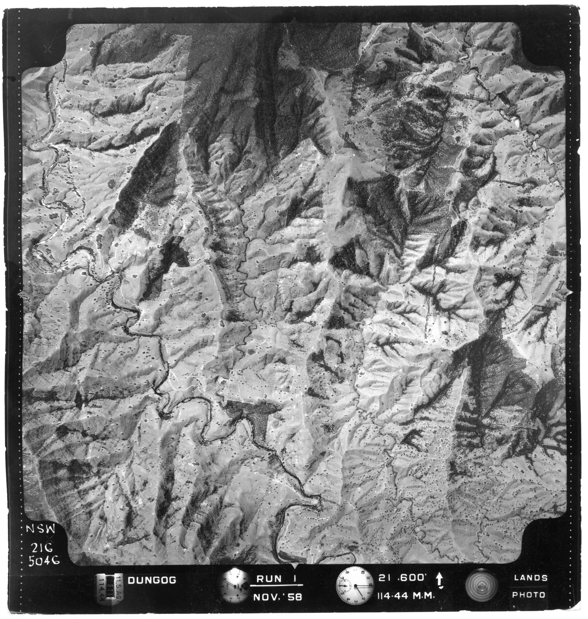 New South Wales. Department of Lands, Dungog, NSW - Aerial photograph, November 1958 (5046) (November, 1958), [DUNGOG-11-1958-R001-216-5046]. Living Histories, accessed 20/03/2026, https://livinghistories.newcastle.edu.au/nodes/view/81829