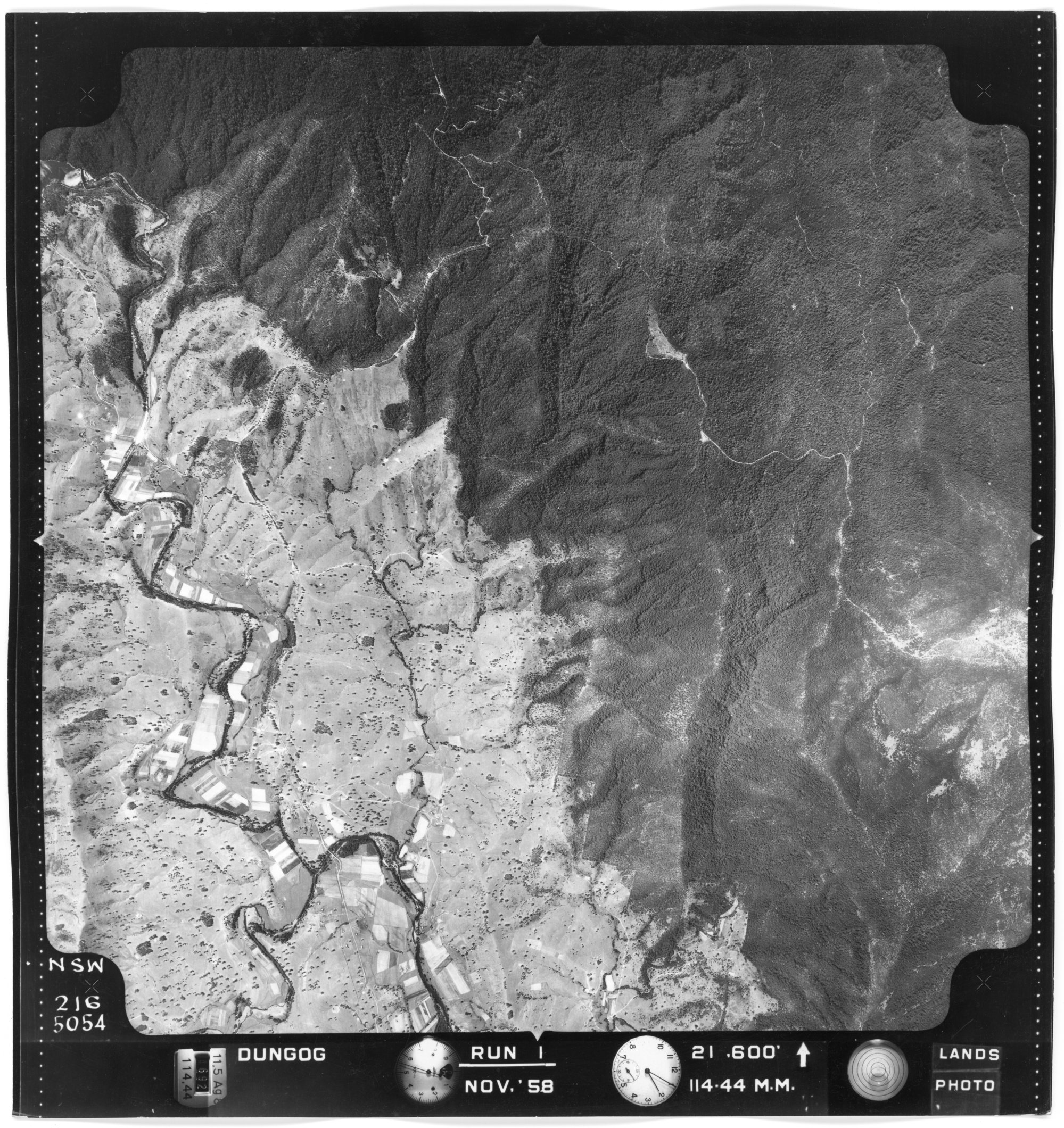 New South Wales. Department of Lands, Dungog, NSW - Aerial photograph, November 1958 (5054) (November, 1958), [DUNGOG-11-1958-R001-216-5054]. Living Histories, accessed 17/01/2026, https://livinghistories.newcastle.edu.au/nodes/view/81837