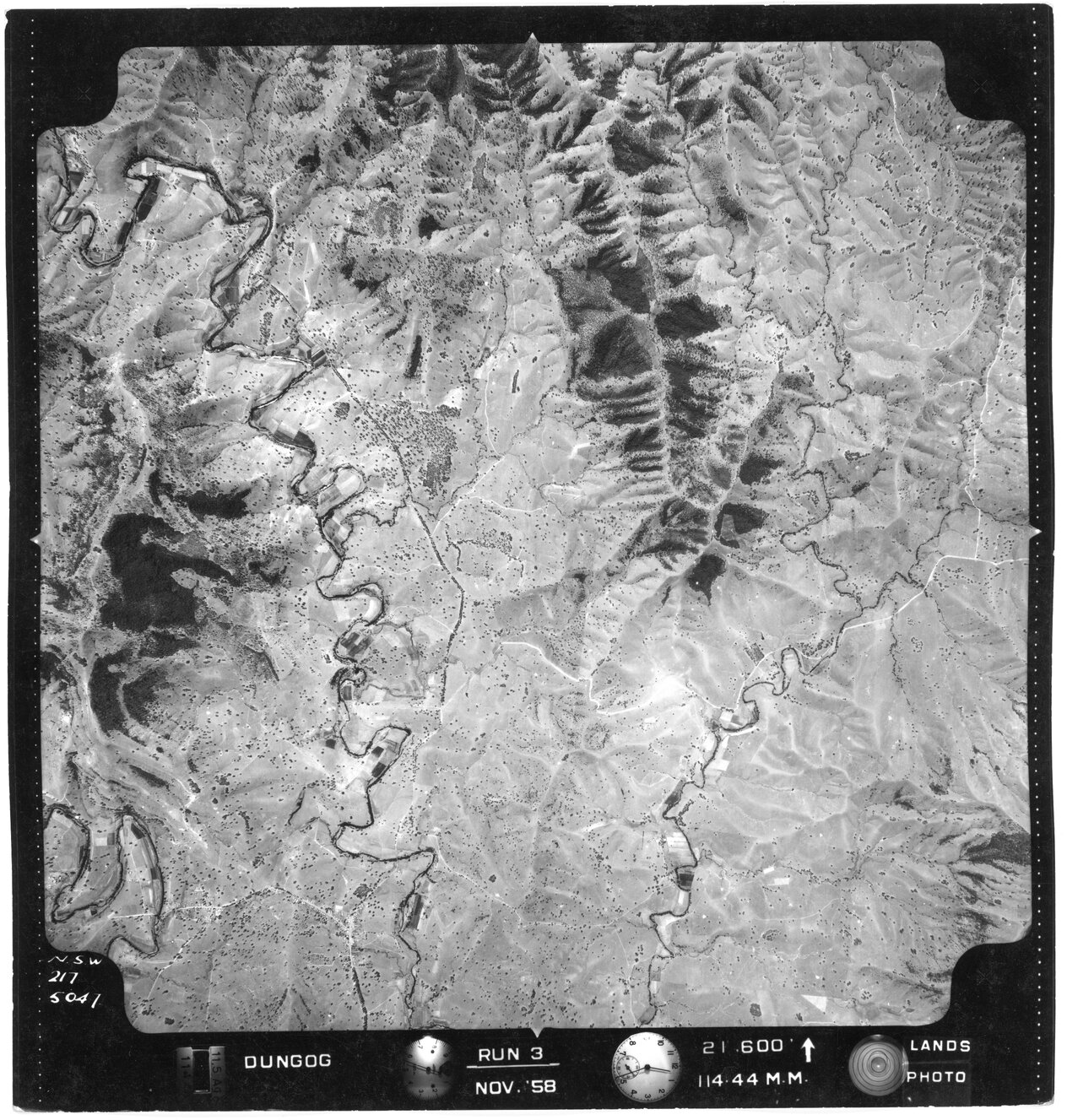 New South Wales. Department of Lands, Dungog, NSW - Aerial photograph, November 1958 (5047) (15th November 1958), [DUNGOG-11-1958-R003-217-5047]. Living Histories, accessed 22/01/2026, https://livinghistories.newcastle.edu.au/nodes/view/81873
