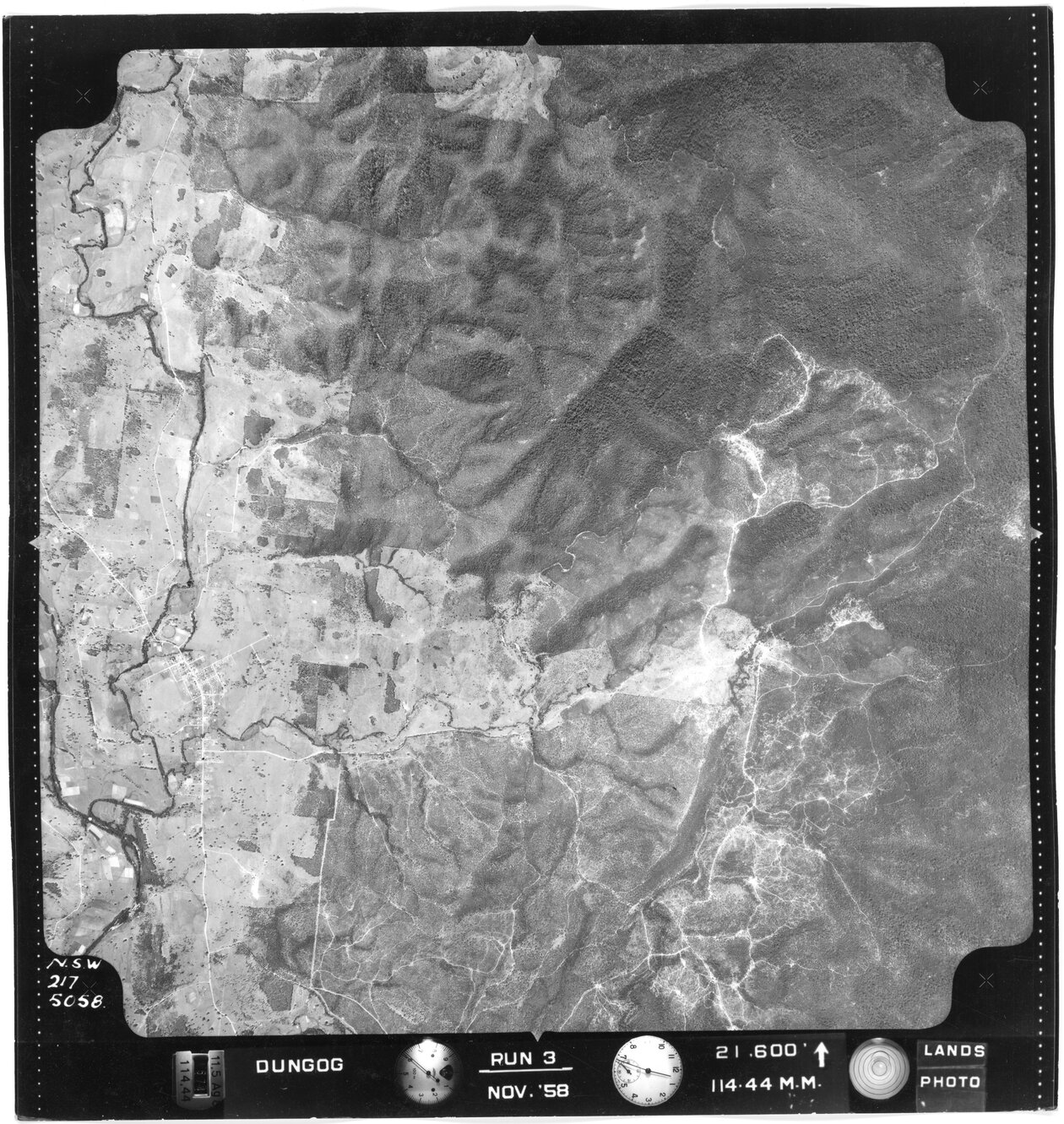 New South Wales. Department of Lands, Dungog, NSW - Aerial photograph, November 1958 (5058) (15th November 1958), [DUNGOG-11-1958-R003-217-5058]. Living Histories, accessed 10/03/2026, https://livinghistories.newcastle.edu.au/nodes/view/81884