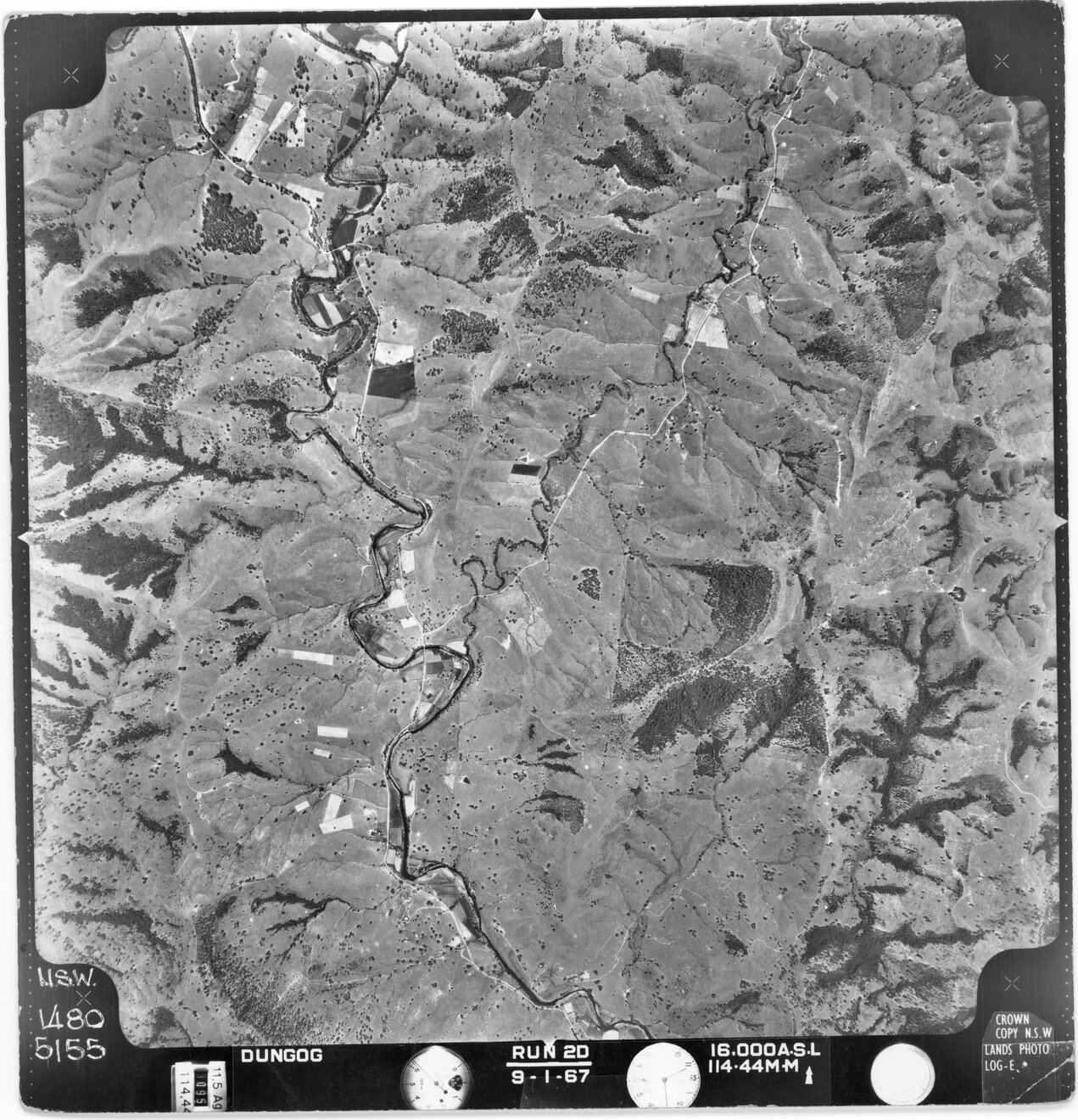 New South Wales. Department of Lands, Dungog, NSW - Aerial photograph, January 1967 (5168) (January, 1967), [DUNGOG-01-1967-R2D-1480-5168]. Living Histories, accessed 18/03/2026, https://livinghistories.newcastle.edu.au/nodes/view/81912