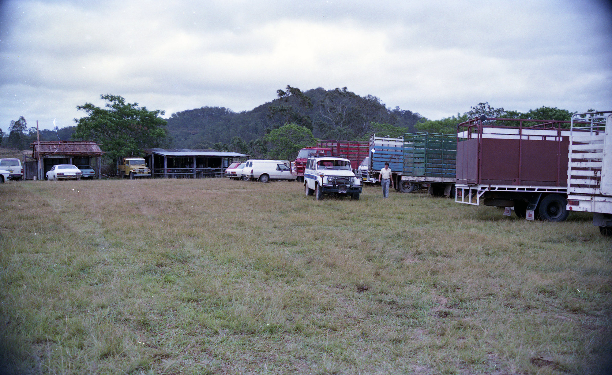 Car and cattle trucks, Cattle sales, Wollombi, NSW, November 1988