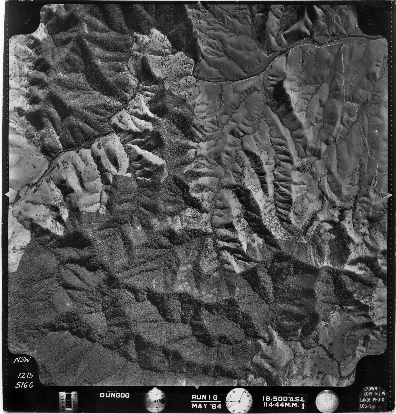 New South Wales. Department of Lands, Dungog, NSW - Aerial photograph, May 1964 (5166) (May, 1964), [DUNGOG-05-1964-R001G-1215-5166]. Living Histories, accessed 18/03/2026, https://livinghistories.newcastle.edu.au/nodes/view/82253