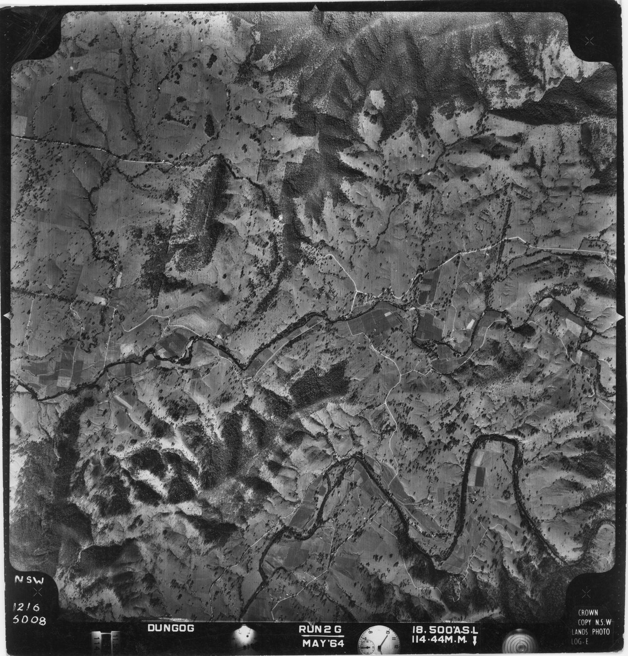 New South Wales. Department of Lands, Dungog, NSW - Aerial photograph, May 1964 (5008) (May, 1964), [DUNGOG-05-1964-R002G-1216-5008]. Living Histories, accessed 09/03/2026, https://livinghistories.newcastle.edu.au/nodes/view/82274