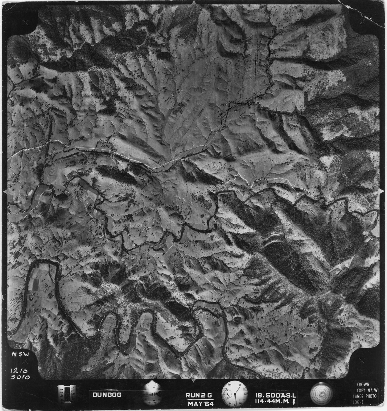 New South Wales. Department of Lands, Dungog, NSW - Aerial photograph, May 1964 (5010) (May, 1964), [DUNGOG-05-1964-R002G-1216-5010]. Living Histories, accessed 20/03/2026, https://livinghistories.newcastle.edu.au/nodes/view/82276
