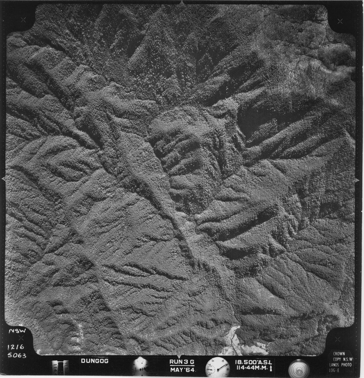 New South Wales. Department of Lands, Dungog, NSW - Aerial photograph, May 1964 (5063) (May, 1964), [DUNGOG-05-1964-R003G-1216-5063]. Living Histories, accessed 16/04/2026, https://livinghistories.newcastle.edu.au/nodes/view/82293