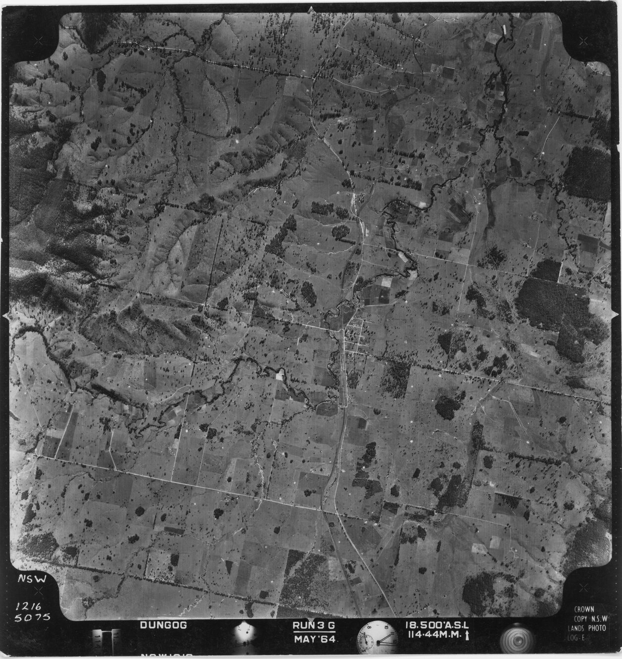New South Wales. Department of Lands, Dungog, NSW - Aerial photograph, May 1964 (5075) (May, 1964), [DUNGOG-05-1964-R003G-1216-5075]. Living Histories, accessed 15/04/2026, https://livinghistories.newcastle.edu.au/nodes/view/82305
