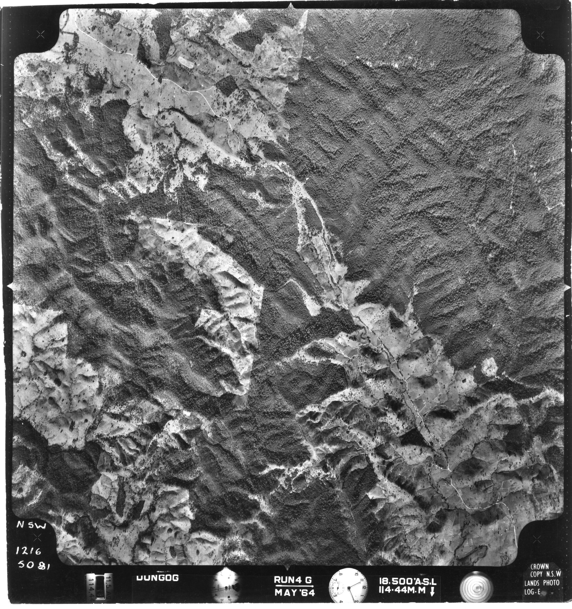 New South Wales. Department of Lands, Dungog, NSW - Aerial photograph, May 1964 (5081) (May, 1964), [DUNGOG-05-1964-R004G-1216-5081]. Living Histories, accessed 15/04/2026, https://livinghistories.newcastle.edu.au/nodes/view/82312