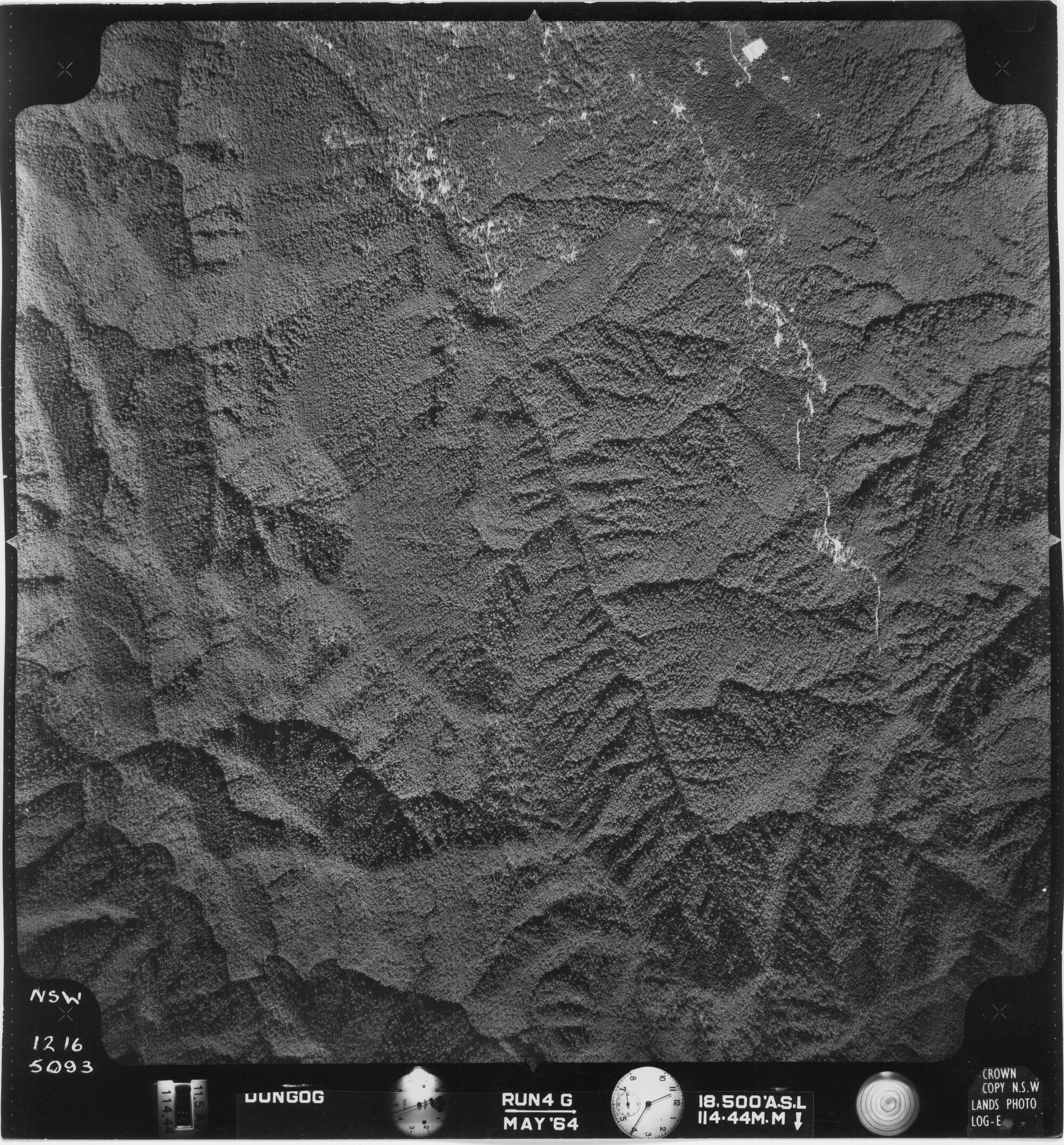 New South Wales. Department of Lands, Dungog, NSW - Aerial photograph, May 1964 (5093) (May, 1964), [DUNGOG-05-1964-R004G-1216-5093]. Living Histories, accessed 16/04/2026, https://livinghistories.newcastle.edu.au/nodes/view/82324