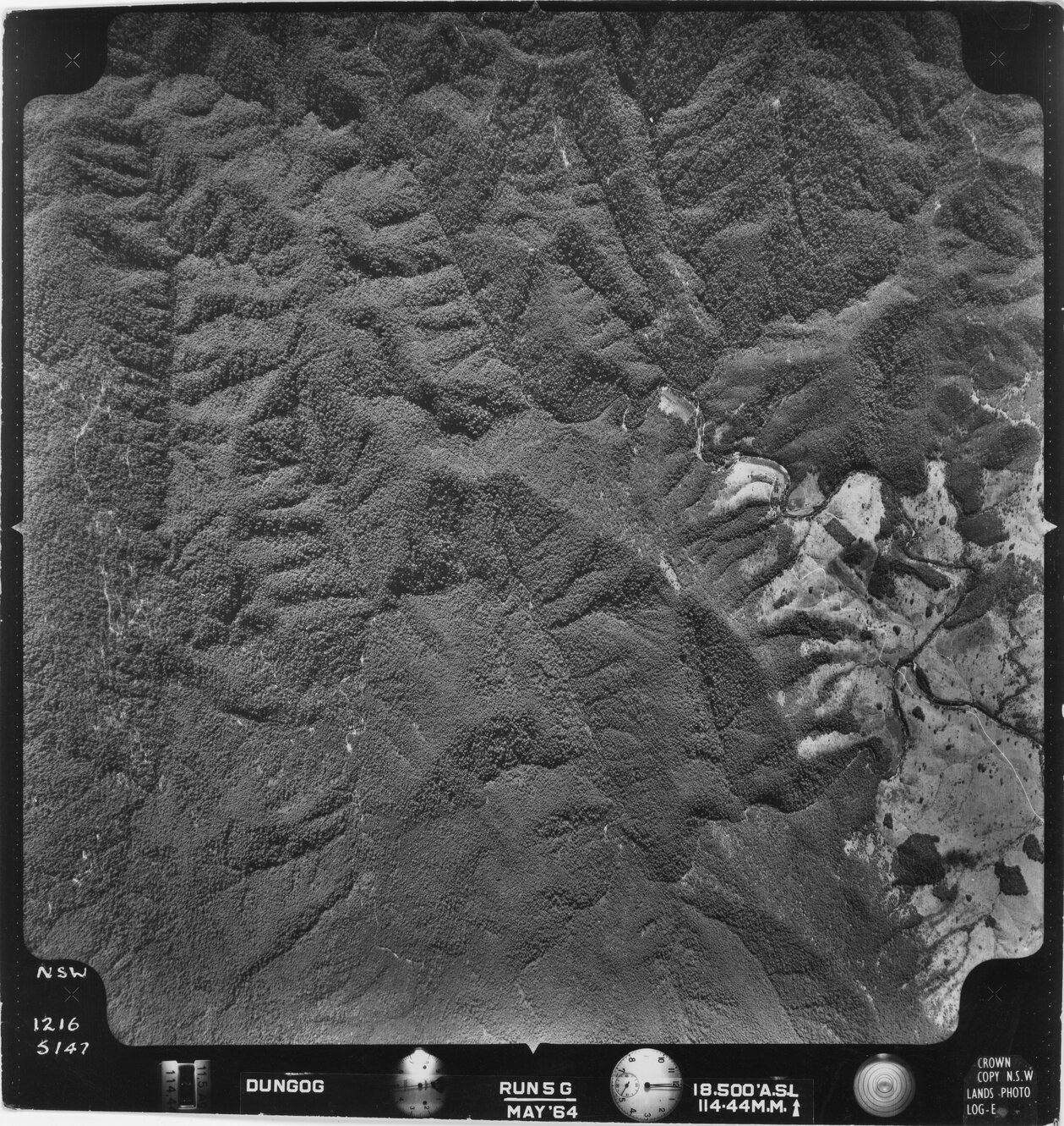 New South Wales. Department of Lands, Dungog, NSW - Aerial photograph, May 1964 (5147) (May, 1964), [DUNGOG-05-1964-R005G-1216-5147]. Living Histories, accessed 06/03/2026, https://livinghistories.newcastle.edu.au/nodes/view/82344