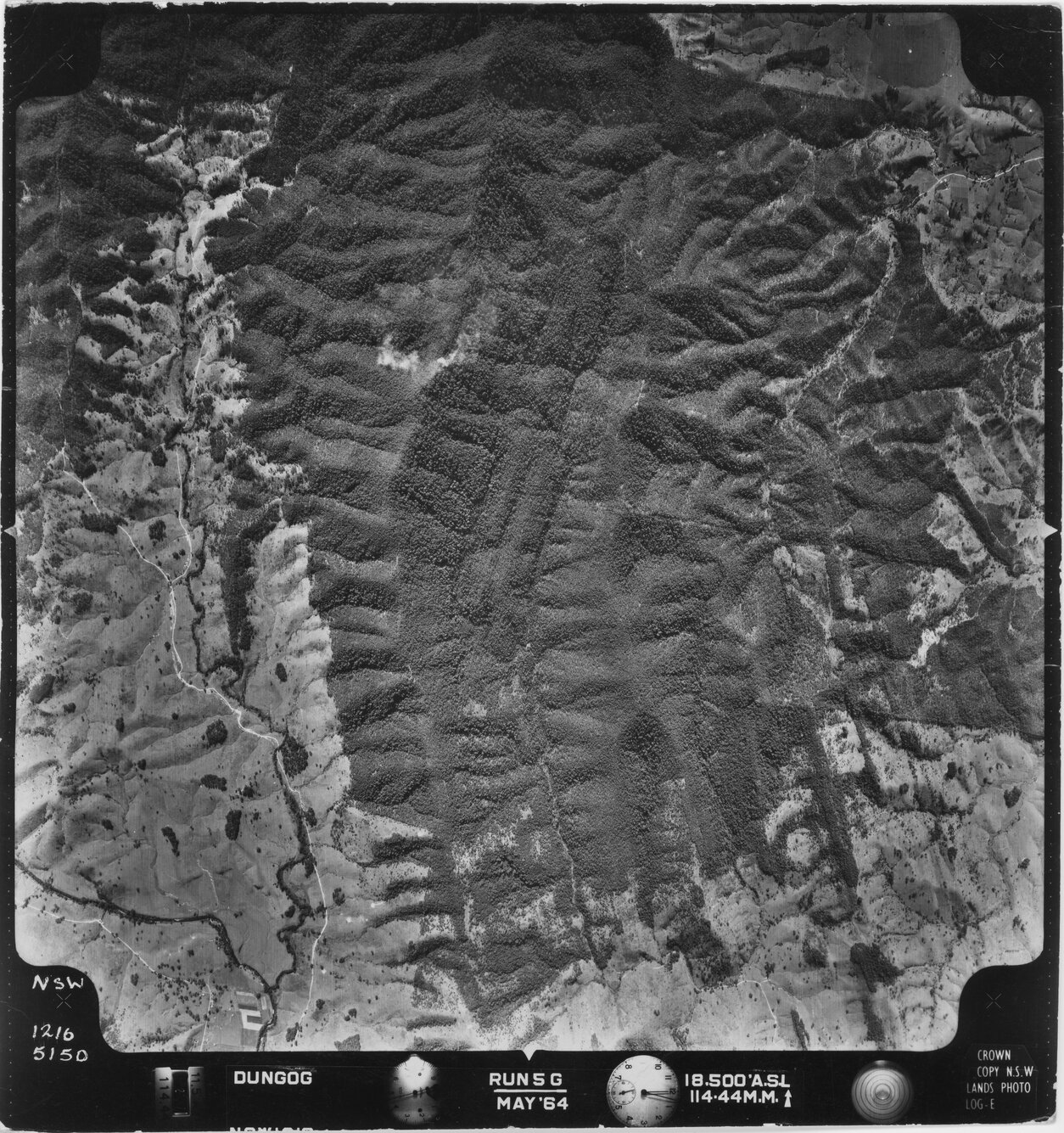 New South Wales. Department of Lands, Dungog, NSW - Aerial photograph, May 1964 (5150) (May, 1964), [DUNGOG-05-1964-R005G-1216-5150]. Living Histories, accessed 15/04/2026, https://livinghistories.newcastle.edu.au/nodes/view/82347