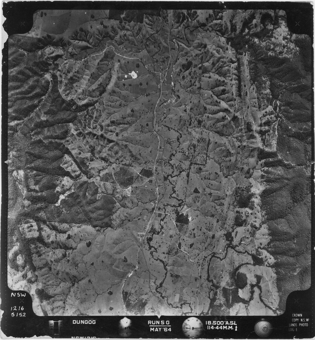 New South Wales. Department of Lands, Dungog, NSW - Aerial photograph, May 1964 (5152) (May, 1964), [DUNGOG-05-1964-R005G-1216-5152]. Living Histories, accessed 20/03/2026, https://livinghistories.newcastle.edu.au/nodes/view/82349