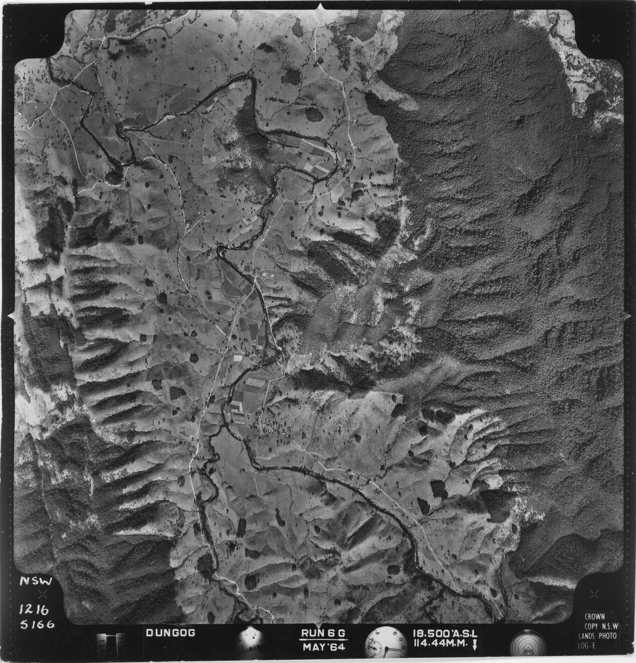 New South Wales. Department of Lands, Dungog, NSW - Aerial photograph, May 1964 (6G-5166) (May, 1964), [DUNGOG-05-1964-R006G-1216-5166]. Living Histories, accessed 17/04/2026, https://livinghistories.newcastle.edu.au/nodes/view/82363
