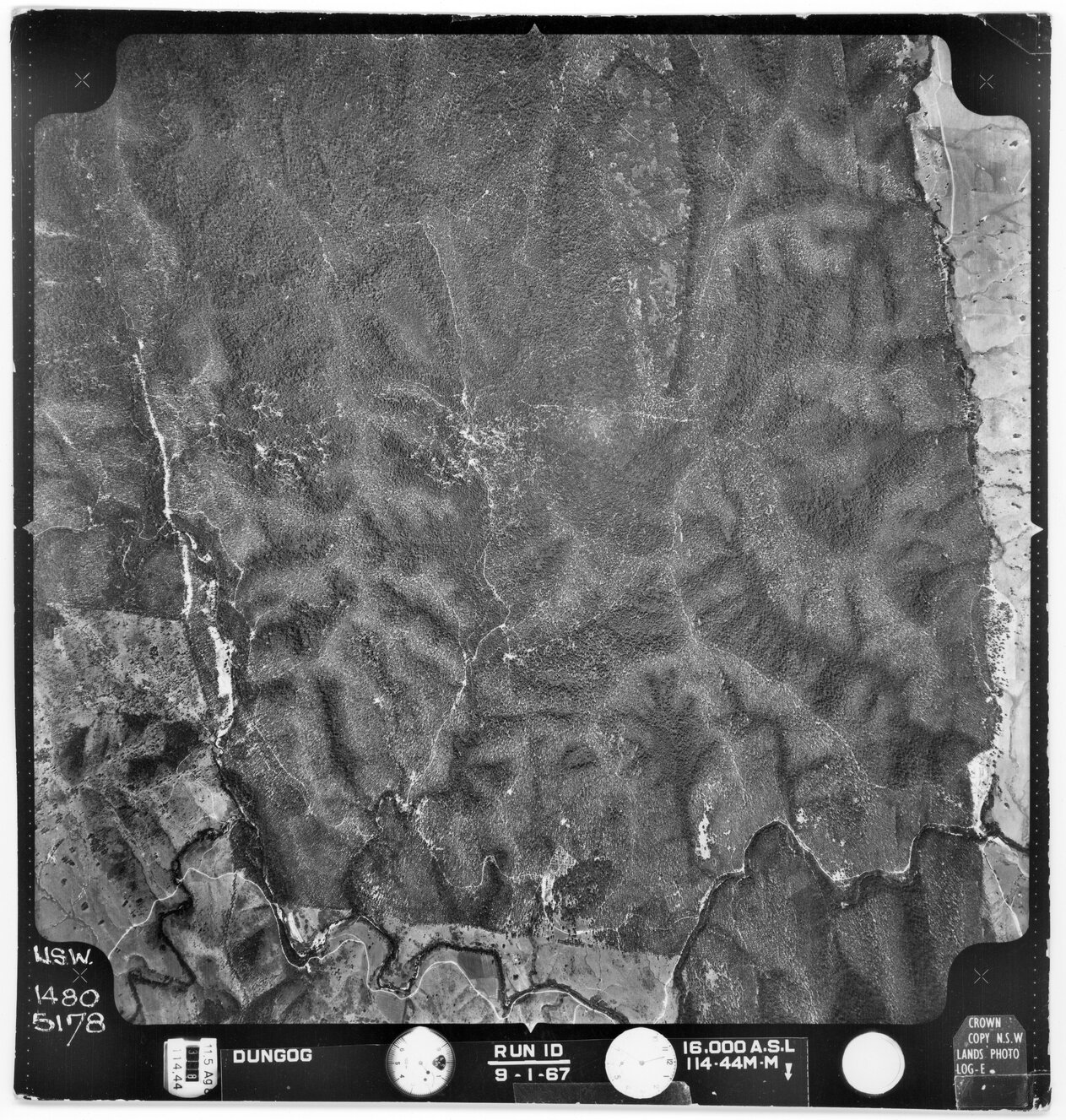 New South Wales. Department of Lands, Dungog, NSW - Aerial photograph, January 1967 (5178) (January, 1967), [DUNGOG-01-1967-R001D-1480-5178]. Living Histories, accessed 19/01/2026, https://livinghistories.newcastle.edu.au/nodes/view/82378