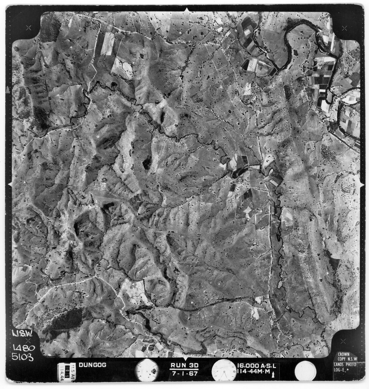 New South Wales. Department of Lands, Dungog, NSW - Aerial photograph, January 1967 (5103) (January, 1967), [DUNGOG-01-1967-R003D-1480-5103]. Living Histories, accessed 19/03/2026, https://livinghistories.newcastle.edu.au/nodes/view/82407