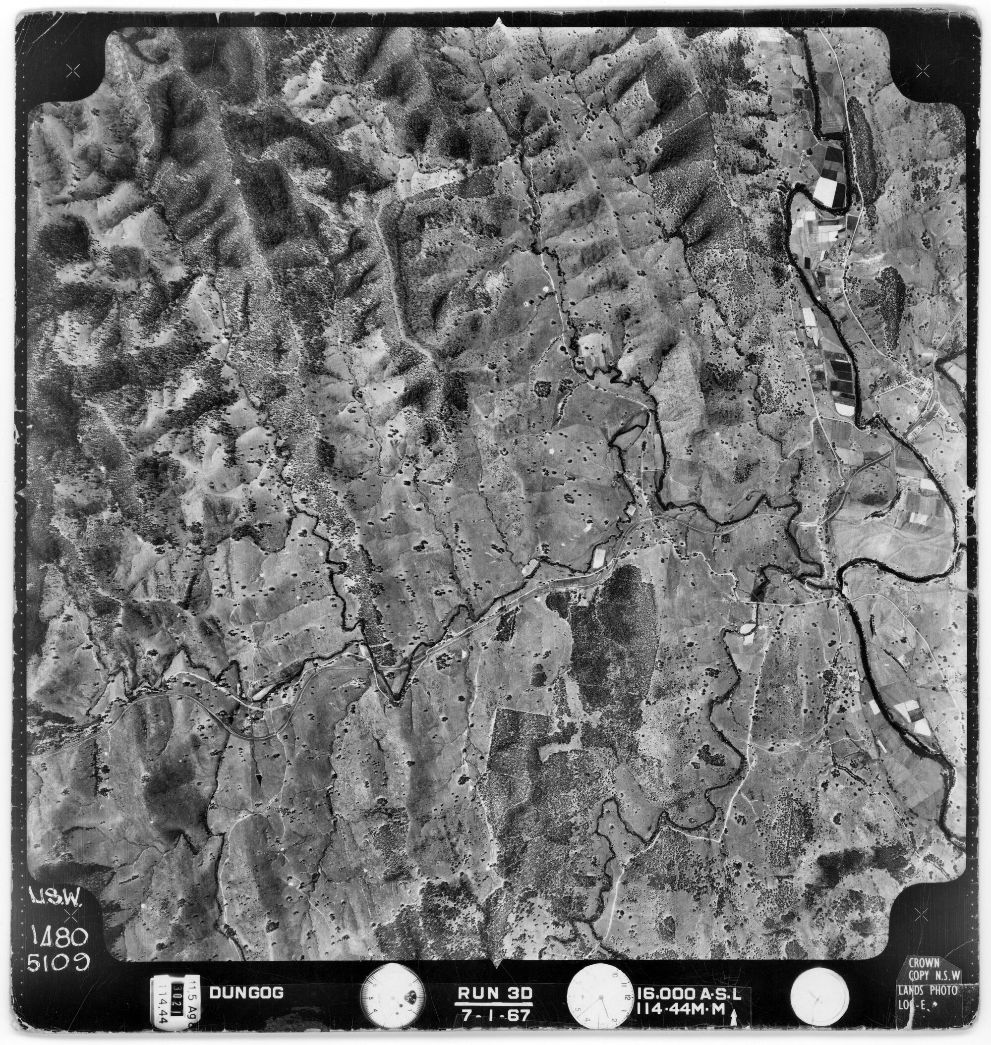 New South Wales. Department of Lands, Dungog, NSW - Aerial photograph, January 1967 (5109) (January, 1967), [DUNGOG-01-1967-R003D-1480-5109]. Living Histories, accessed 18/03/2026, https://livinghistories.newcastle.edu.au/nodes/view/82413