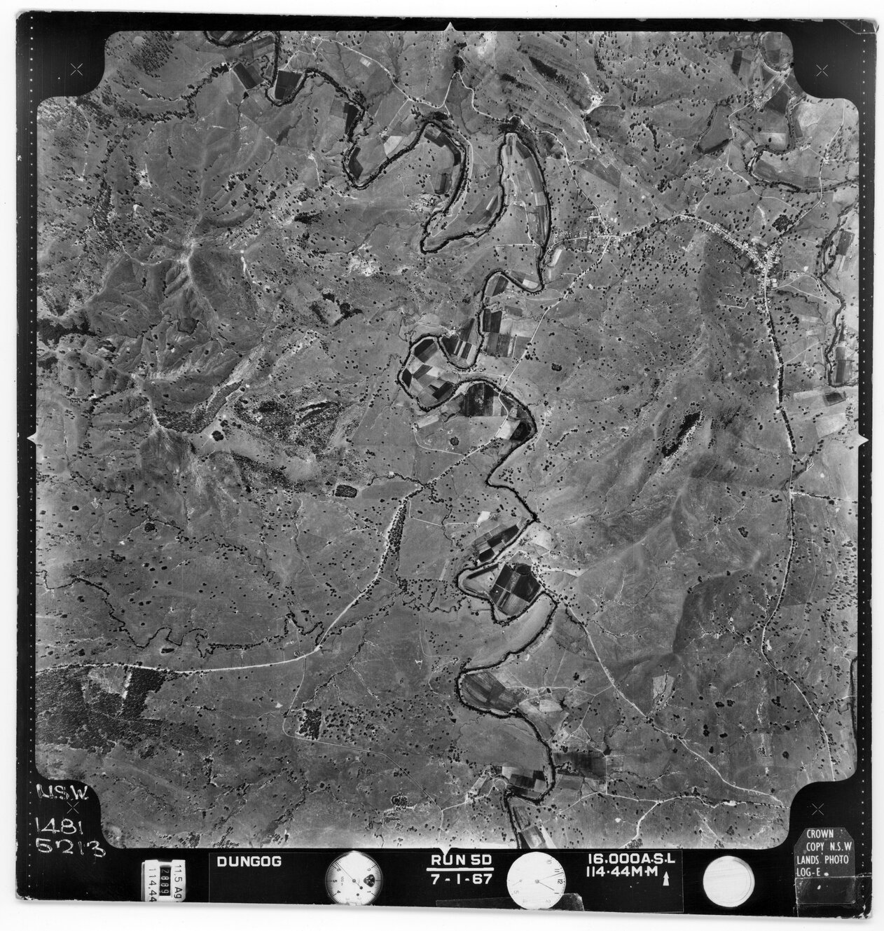 New South Wales. Department of Lands, Dungog, NSW - Aerial photograph, January 1967 (5213) (January, 1967), [DUNGOG-01-1967-R005D-1481-5213]. Living Histories, accessed 10/02/2026, https://livinghistories.newcastle.edu.au/nodes/view/82443