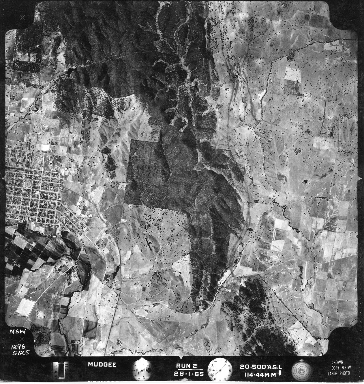 New South Wales. Department of Lands, Mudgee, NSW - Aerial photograph, January 1965 (5125) (January, 1965), [MUDGEE-01-1965-R002-1296-5125]. Living Histories, accessed 09/03/2026, https://livinghistories.newcastle.edu.au/nodes/view/82583