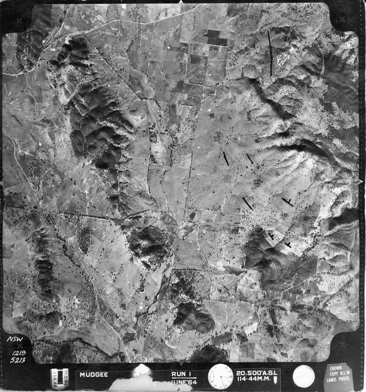 New South Wales. Department of Lands, Mudgee, NSW - Aerial photograph, June 1964 (5213) (June, 1964), [MUDGEE-06-1964-R001-1219-5213]. Living Histories, accessed 22/01/2026, https://livinghistories.newcastle.edu.au/nodes/view/82599