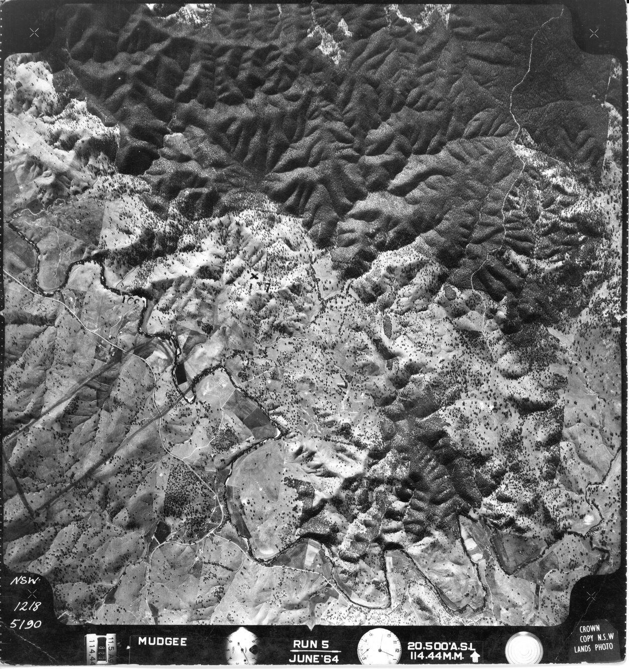 New South Wales. Department of Lands, Mudgee, NSW - Aerial photograph, June 1964 (5190) (June, 1964), [MUDGEE-06-1964-R005-1218-5190]. Living Histories, accessed 18/02/2026, https://livinghistories.newcastle.edu.au/nodes/view/82613