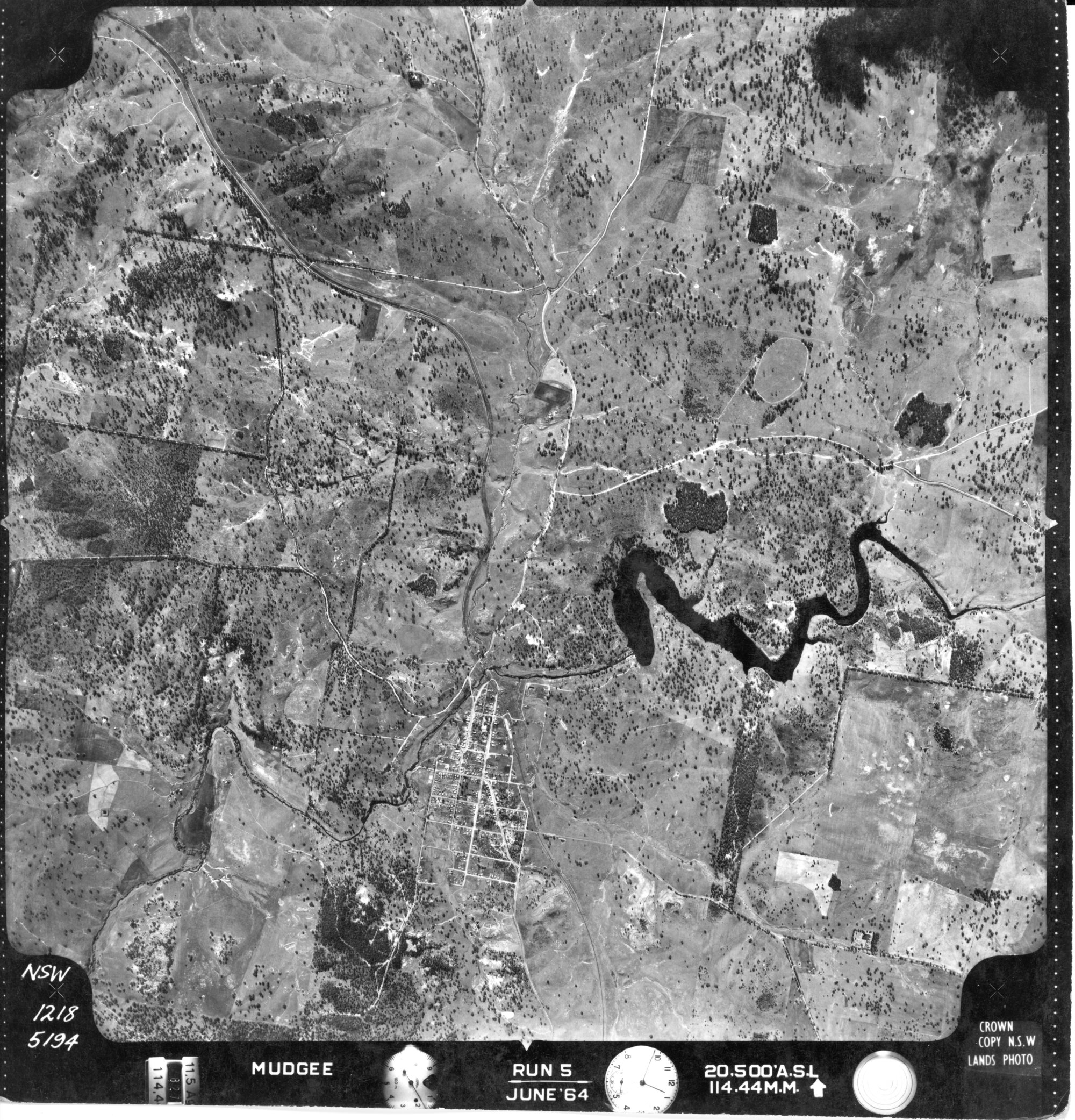 New South Wales. Department of Lands, Mudgee, NSW - Aerial photograph, June 1964 (5194) (June, 1964), [MUDGEE-06-1964-R005-1218-5194]. Living Histories, accessed 17/04/2026, https://livinghistories.newcastle.edu.au/nodes/view/82617