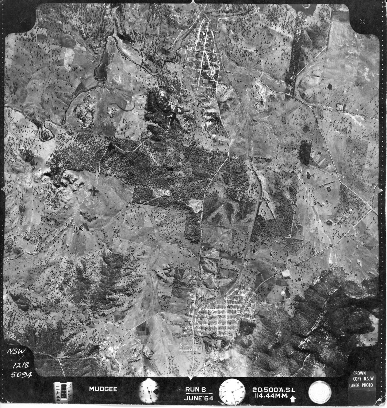 New South Wales. Department of Lands, Mudgee, NSW - Aerial photograph, June 1964 (5094) (June, 1964), [MUDGEE-06-1964-R006-1218-5094]. Living Histories, accessed 24/01/2026, https://livinghistories.newcastle.edu.au/nodes/view/82624