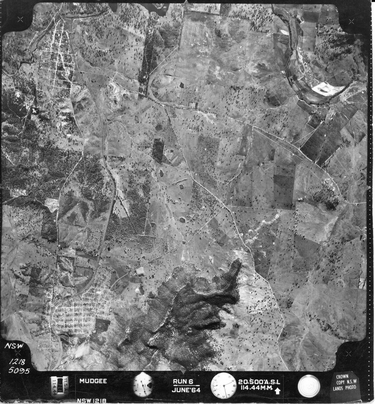New South Wales. Department of Lands, Mudgee, NSW - Aerial photograph, June 1964 (5095) (June, 1964), [MUDGEE-06-1964-R006-1218-5095]. Living Histories, accessed 16/04/2026, https://livinghistories.newcastle.edu.au/nodes/view/82625