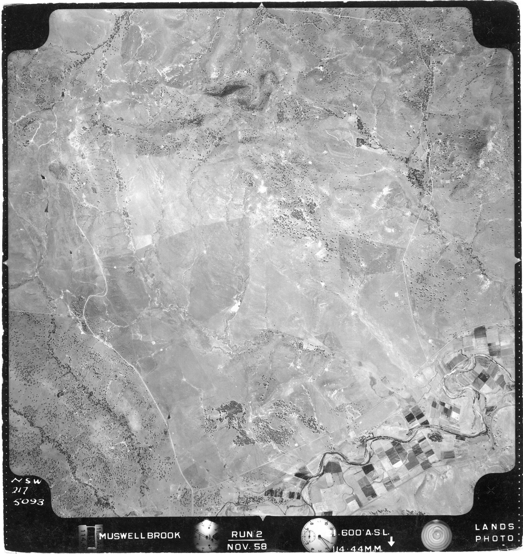 New South Wales. Department of Lands, Muswellbrook, NSW - Aerial photograph, November 1958 (R2-5093) (November, 1958), [MUSWELLBROOK-011-1958-R002-1593-217-5093]. Living Histories, accessed 15/04/2026, https://livinghistories.newcastle.edu.au/nodes/view/82708
