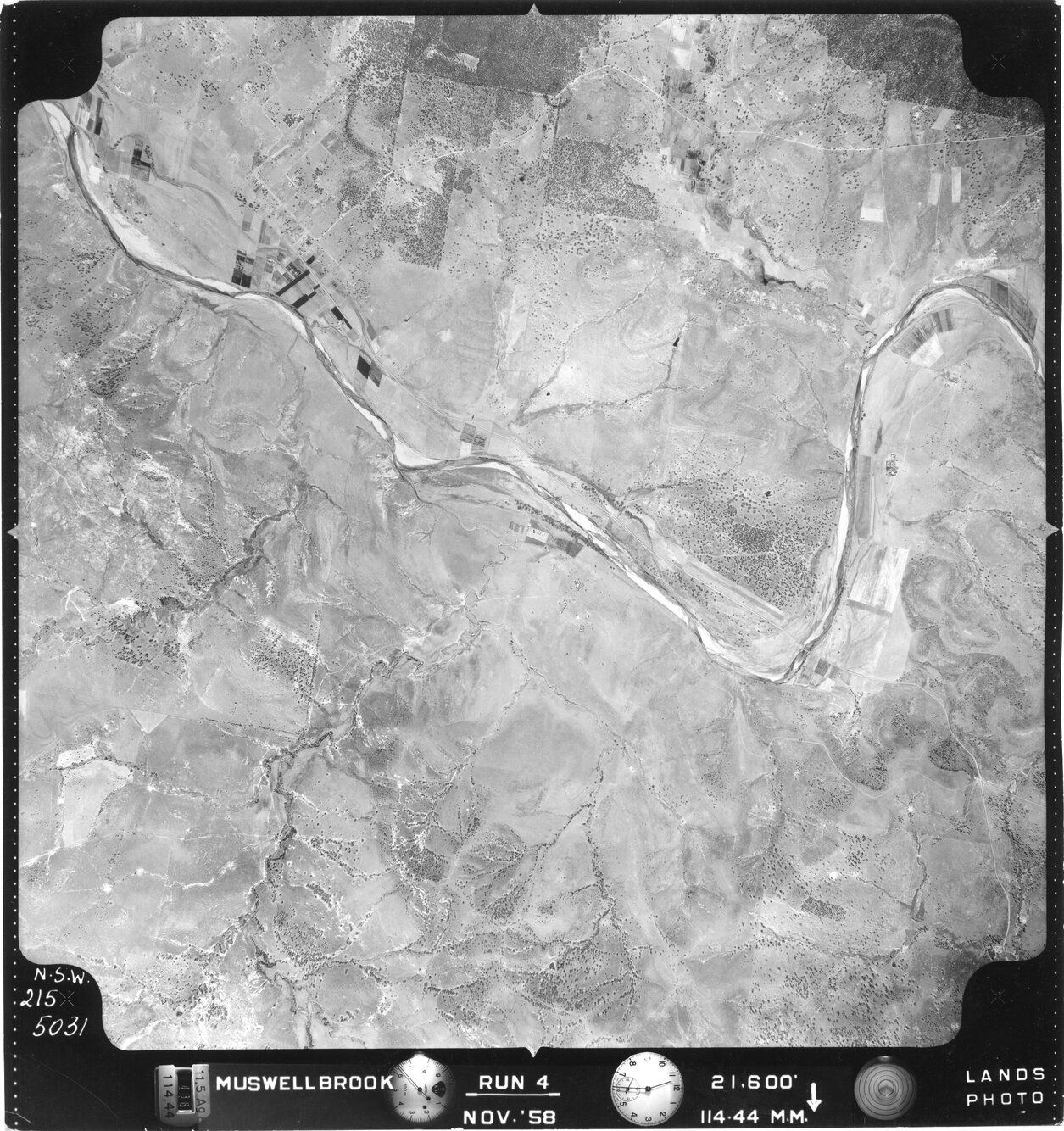 New South Wales. Department of Lands, Muswellbrook, NSW - Aerial photograph, November 1958 (R4-5031) (November, 1958), [MUSWELLBROOK-011-1958-R004-1595-215-5031]. Living Histories, accessed 19/03/2026, https://livinghistories.newcastle.edu.au/nodes/view/82795