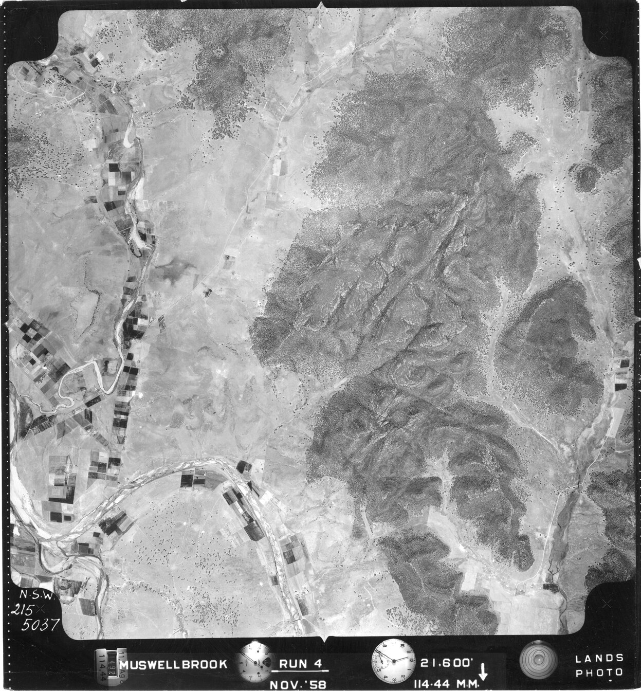 New South Wales. Department of Lands, Muswellbrook, NSW - Aerial photograph, November 1958 (R4-5037) (November, 1958), [MUSWELLBROOK-011-1958-R004-1595-215-5037]. Living Histories, accessed 20/03/2026, https://livinghistories.newcastle.edu.au/nodes/view/82801