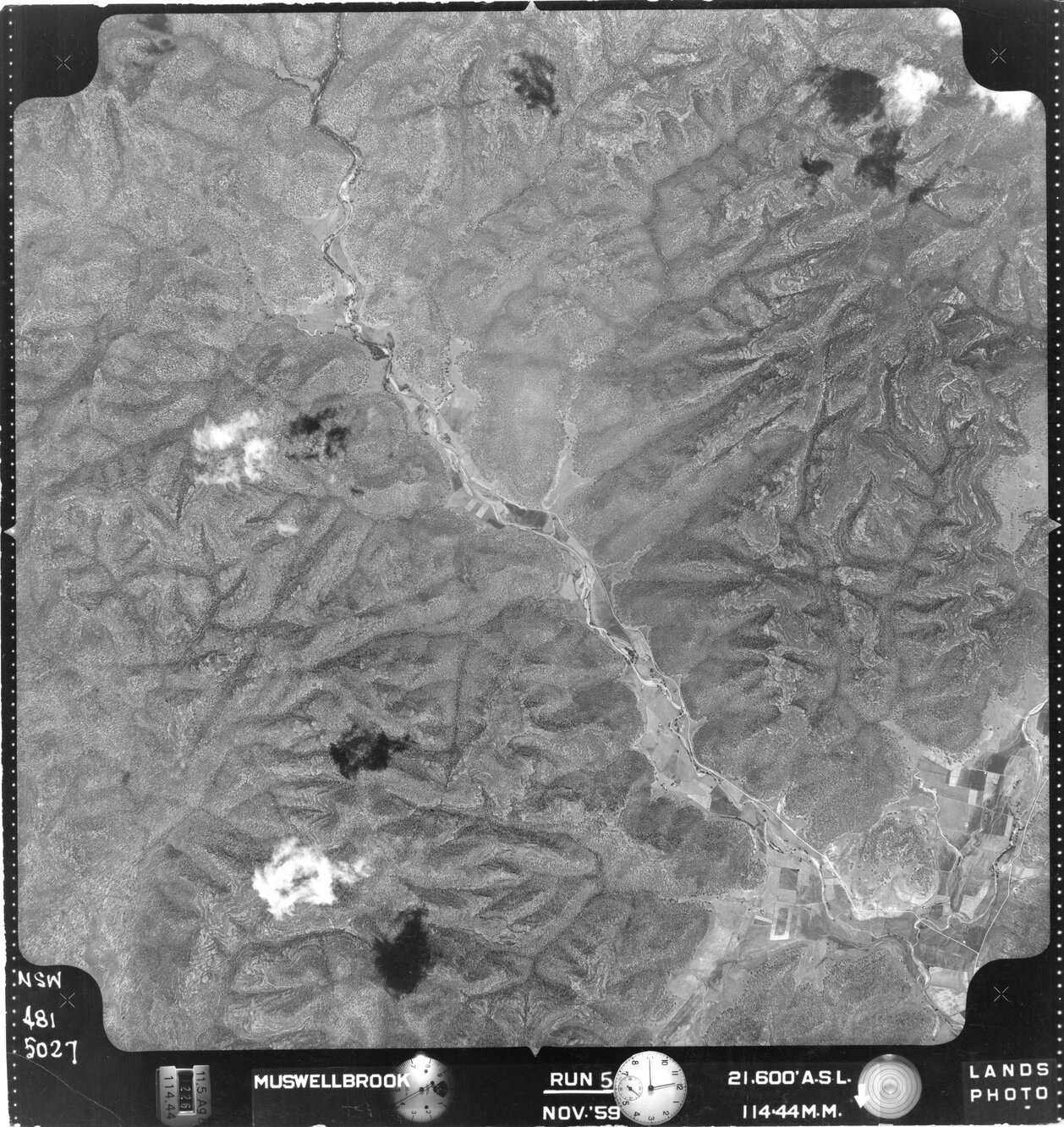 New South Wales. Department of Lands, Muswellbrook, NSW - Aerial photograph, November 1959 (5027) (November, 1959), [MUSWELLBROOK-011-1959-R005-1596-481-5027]. Living Histories, accessed 14/04/2026, https://livinghistories.newcastle.edu.au/nodes/view/82818