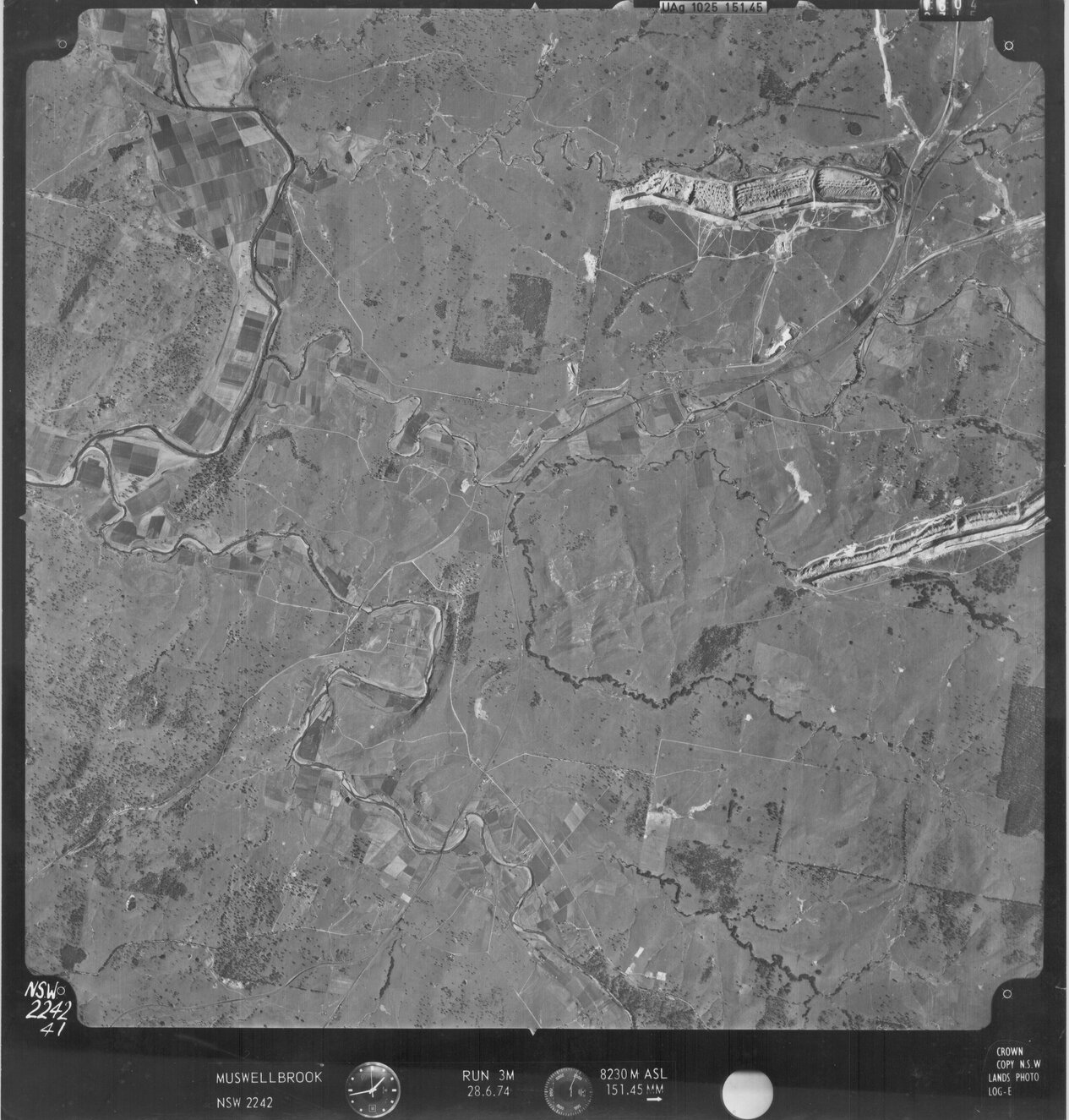 New South Wales. Department of Lands, Muswellbrook, NSW - Aerial photograph, June 1974 (41) (June, 1974), [MUSWELLBROOK-06-1974-R003M-2242-41]. Living Histories, accessed 20/01/2026, https://livinghistories.newcastle.edu.au/nodes/view/82819