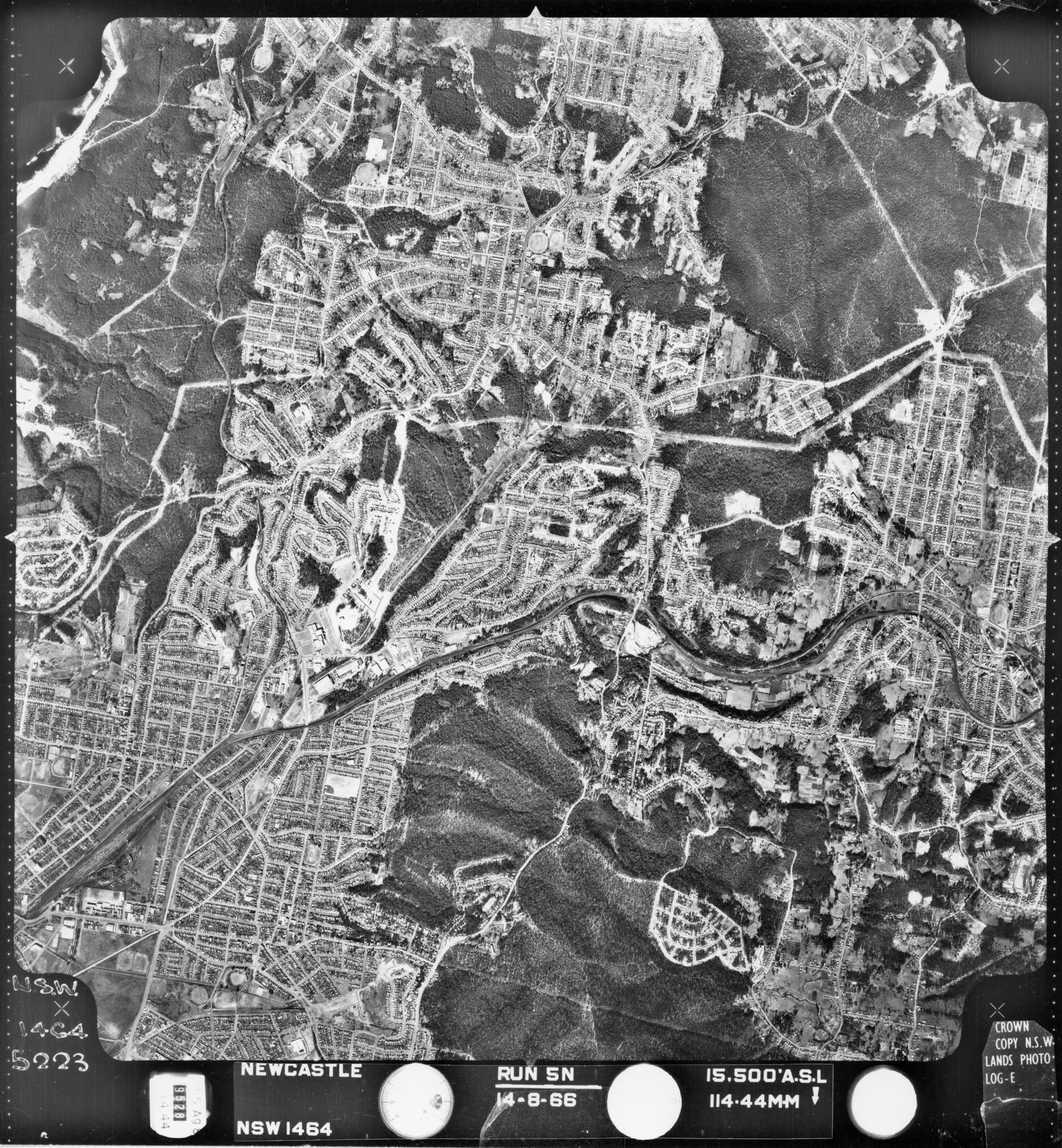New South Wales. Department of Lands, Newcastle, NSW - Aerial photograph, August 1966 (5223) (August, 1966), [NEWCASTLE-08-1966-R5N-1464-5223]. Living Histories, accessed 18/03/2026, https://livinghistories.newcastle.edu.au/nodes/view/82923