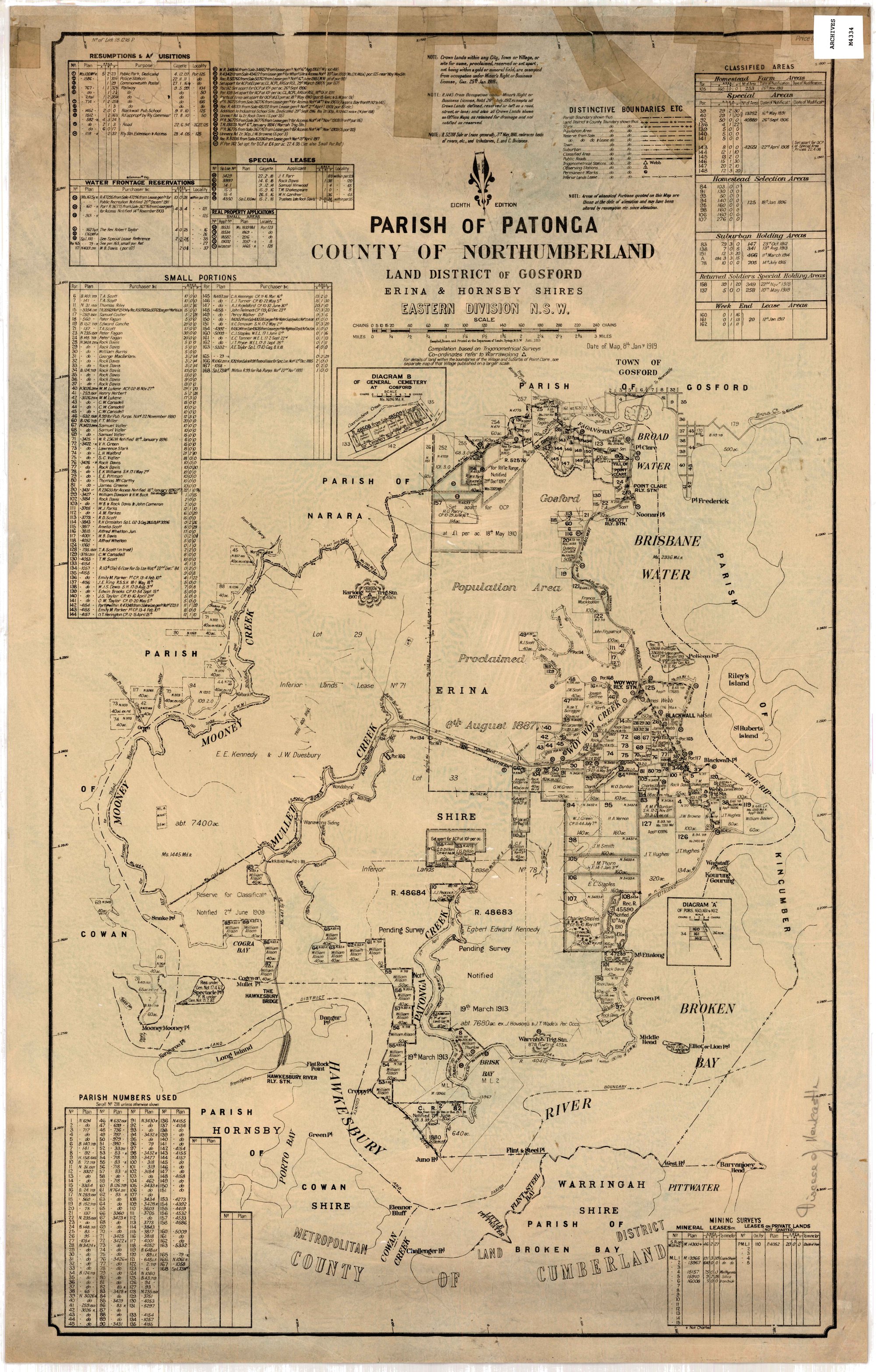 New South Wales. Department of Lands, Sydney, Parish of Patonga, County of Northumberland, Land District of Gosford, Erina and Hornsby Shires, Eastern Division, NSW, 1918 (8th January 1919), [M4334]. Living Histories, accessed 15/04/2026, https://livinghistories.newcastle.edu.au/nodes/view/83476