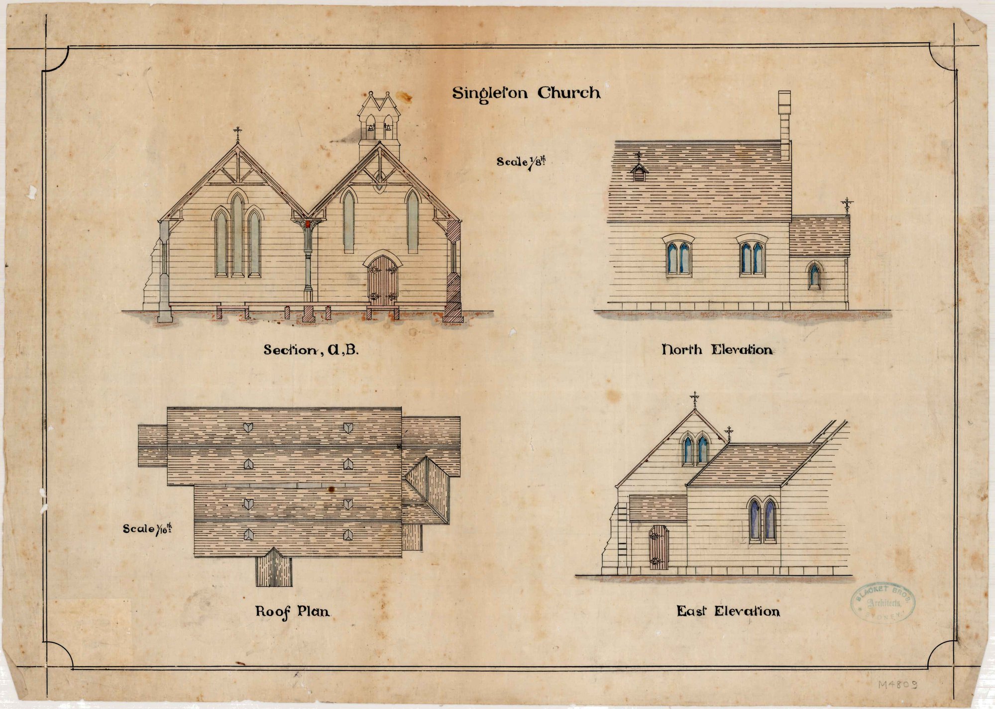 Blacket Bros. Architects Sydney, Section A, B. North Elevation. East Elevation, Roof Plan : [All Saints Anglican Church, Singleton], NSW, [1880s] ([1880s]), [M4809]. Living Histories, accessed 10/02/2026, https://livinghistories.newcastle.edu.au/nodes/view/83506
