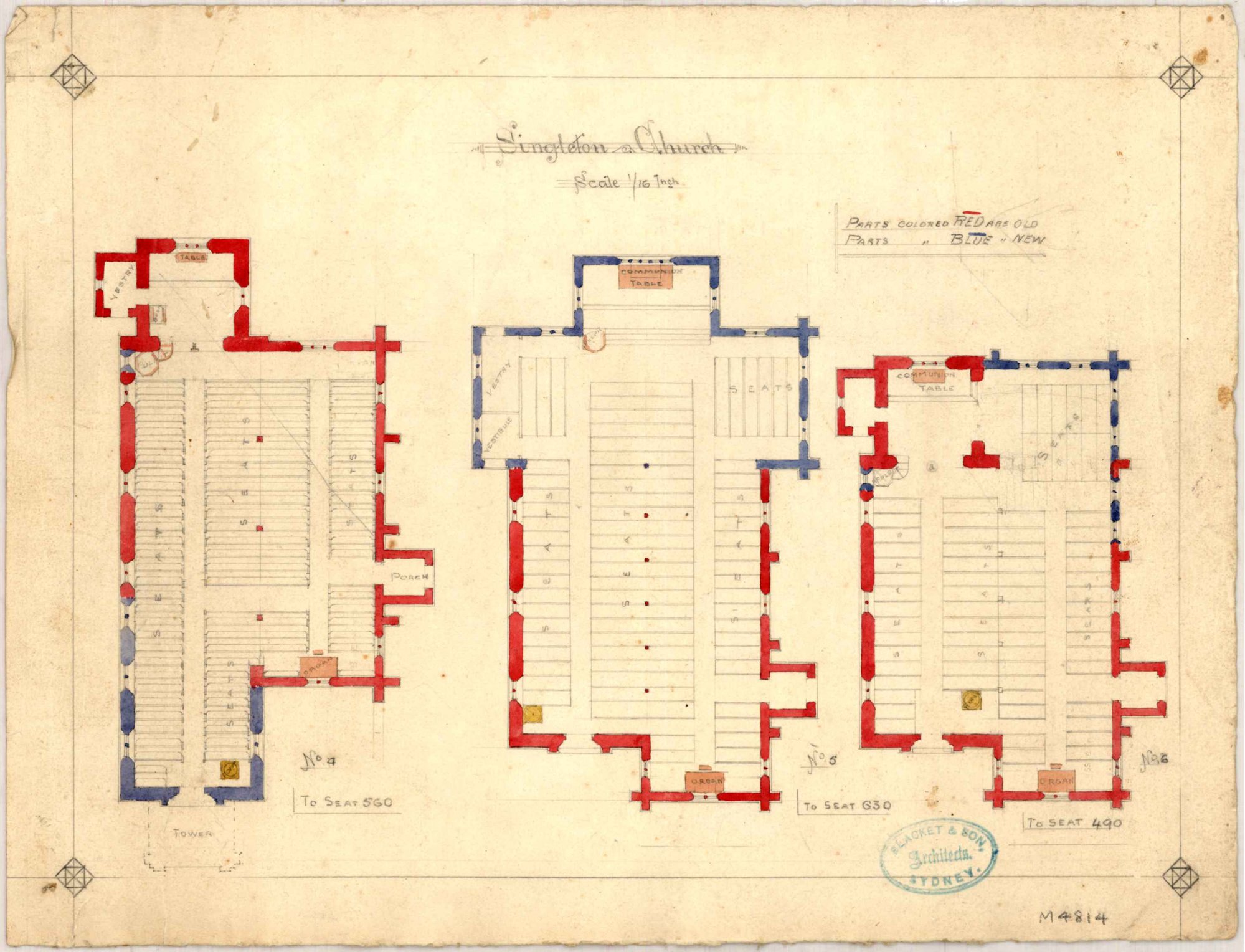 Blacket & Son. Architects Sydney, Plans of Church to seat 560, 630 and 490 : [All Saints Anglican Church, Singleton, NSW], [1882] ([1882]), [M4814]. Living Histories, accessed 07/03/2026, https://livinghistories.newcastle.edu.au/nodes/view/83511