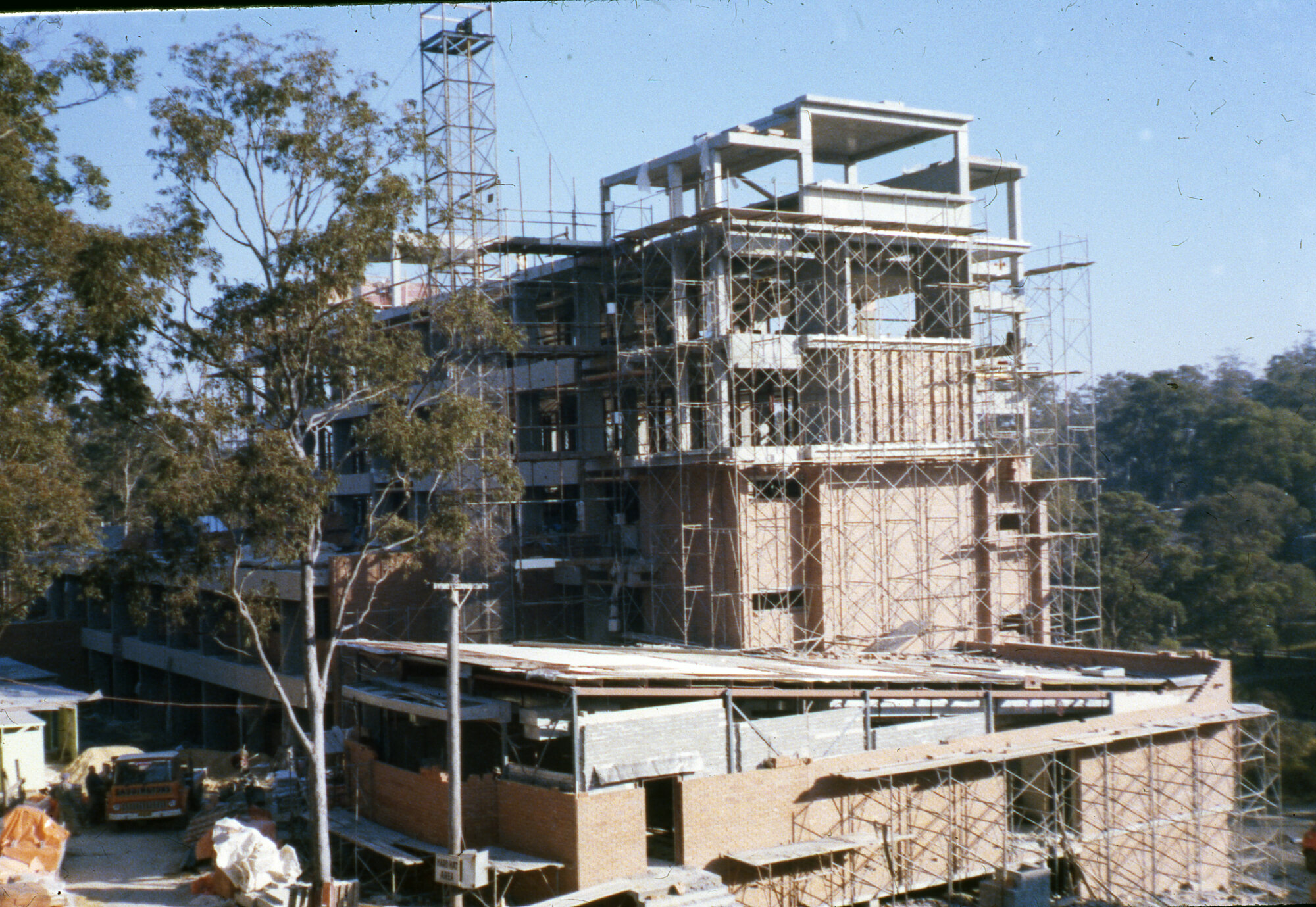 Medical Communication Unit, University of Newcastle, Australia, New Medical Sciences Building - Scaffolding, upper floors & brickwork - University of Newcastle, Australia, [MCU-MSBConstruction007]. Living Histories, accessed 15/01/2026, https://livinghistories.newcastle.edu.au/nodes/view/8358