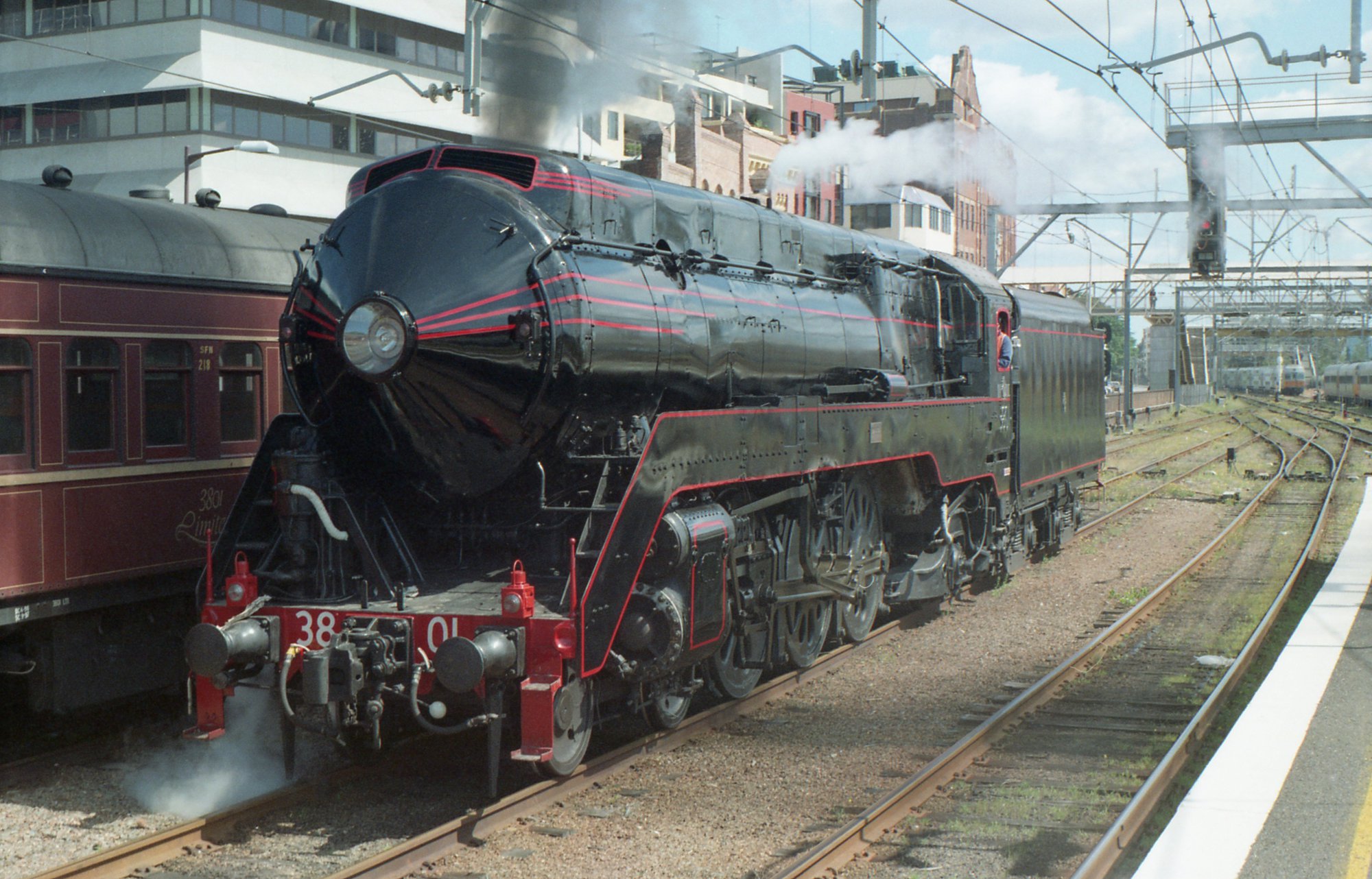 Sansom, Peter, 3801 in a black colour scheme on the engine release road at Newcastle, NSW, [OL_SANSOM_0554]. Living Histories, accessed 19/03/2026, https://livinghistories.newcastle.edu.au/nodes/view/84022