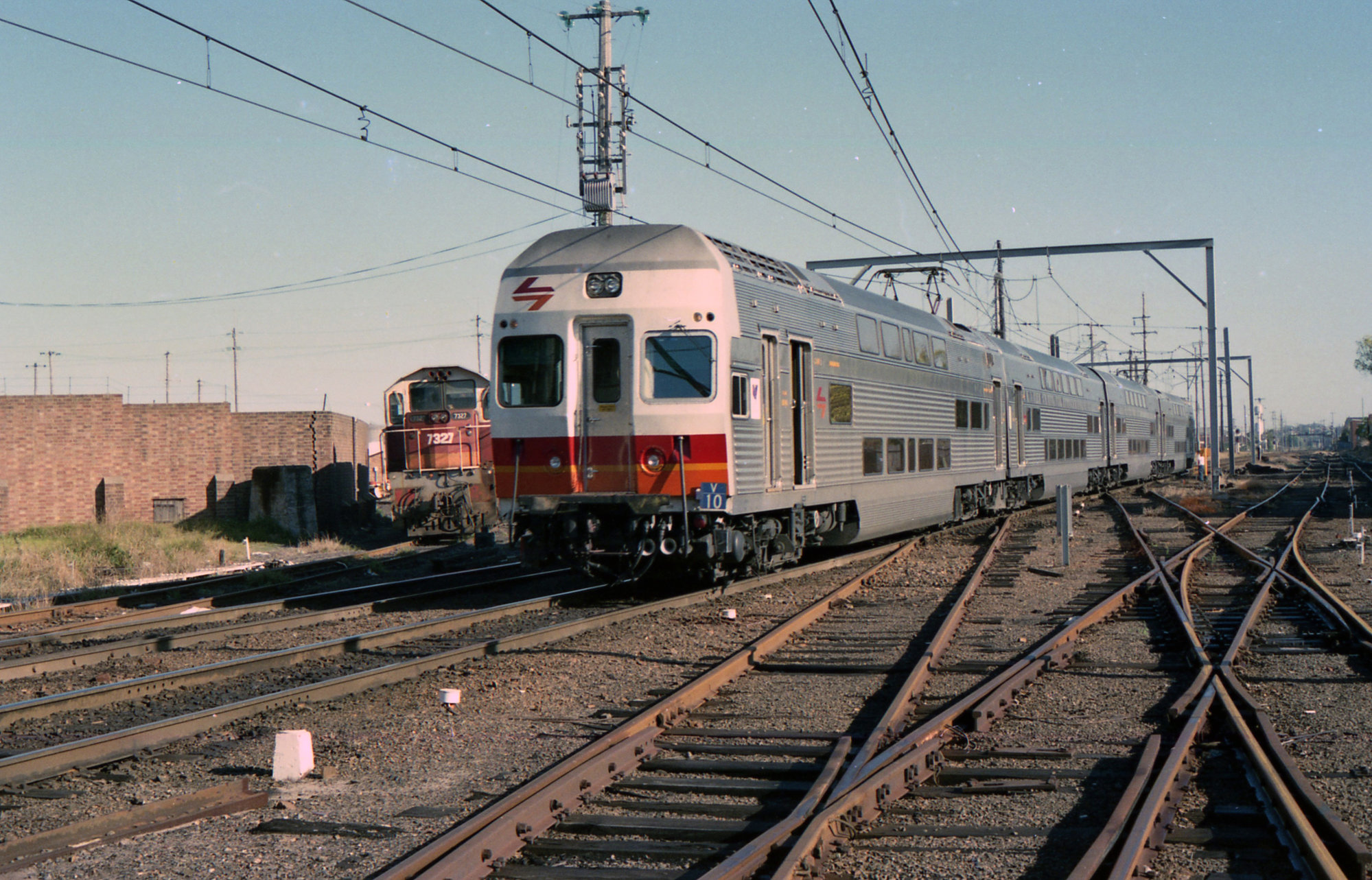 A V set approaches Hamilton while 7327 waits for the road in the perway siding