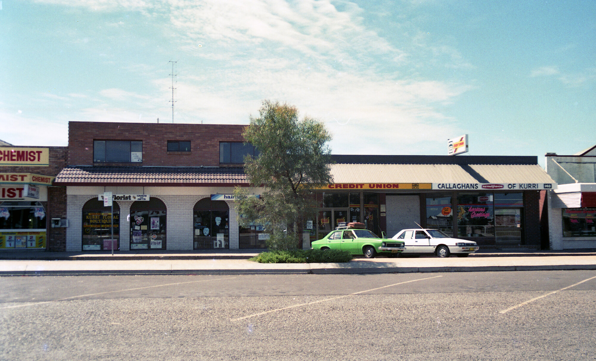 Sternbeck, Percival William, 1921-2004, Kurri Floral Boutique, Hairdresser, Credit Union, Callaghans of Kurri Retravision, Lang Street, Kurri Kurri, NSW, January 1988 (1988-01), [Sternbeck_Bk_14_Jan_1988d_001]. Living Histories, accessed 18/03/2026, https://livinghistories.newcastle.edu.au/nodes/view/84429