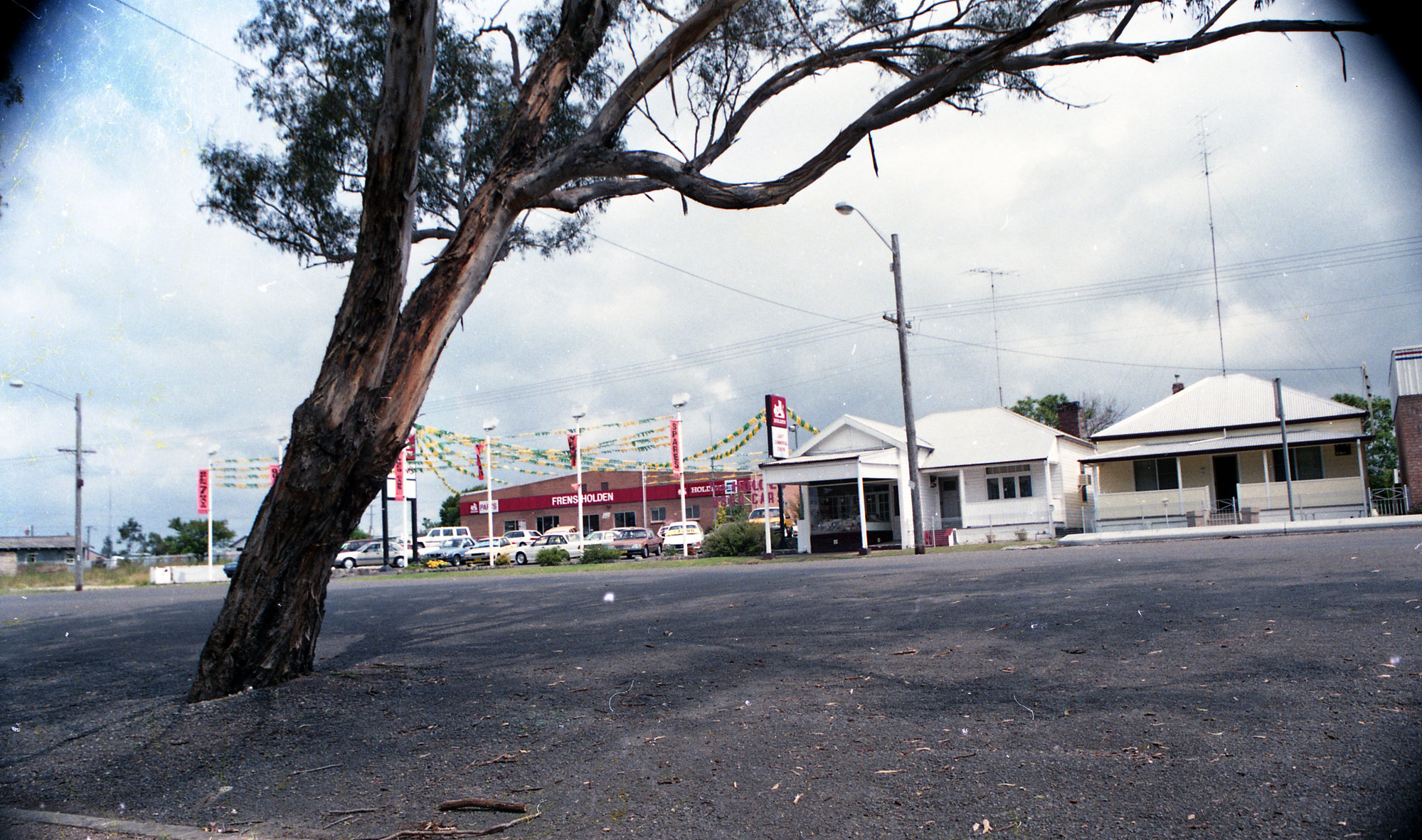 Stormy sky over Frens Holden car yard, Kurri Kurri, NSW, December 1987