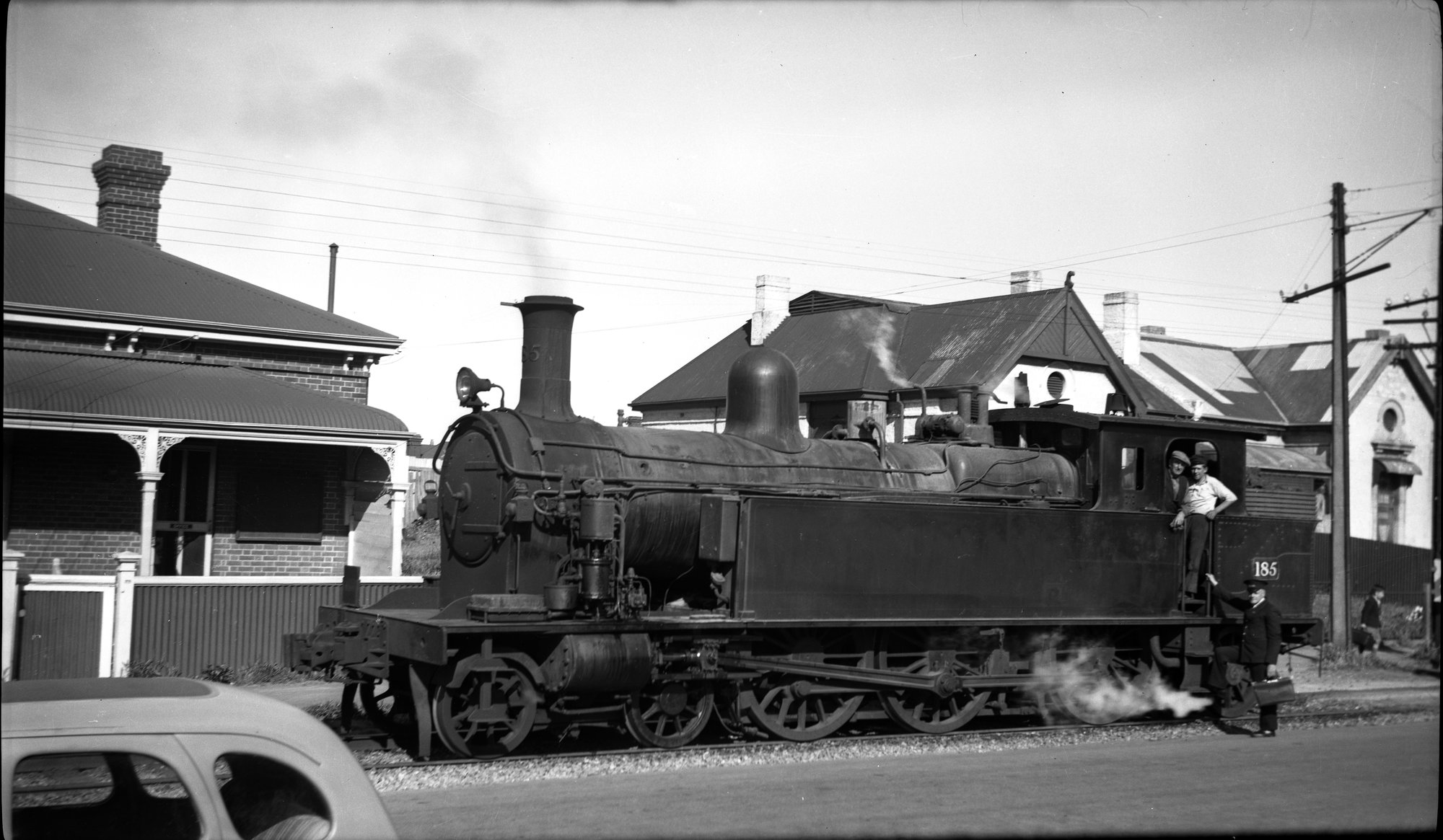 SAR F Class 4-6-2T, no. 185, Henley Beach, Adelaide area, [n.d.], [ARHSBox067_1830]. Living Histories, accessed 16/02/2026, https://livinghistories.newcastle.edu.au/nodes/view/85491